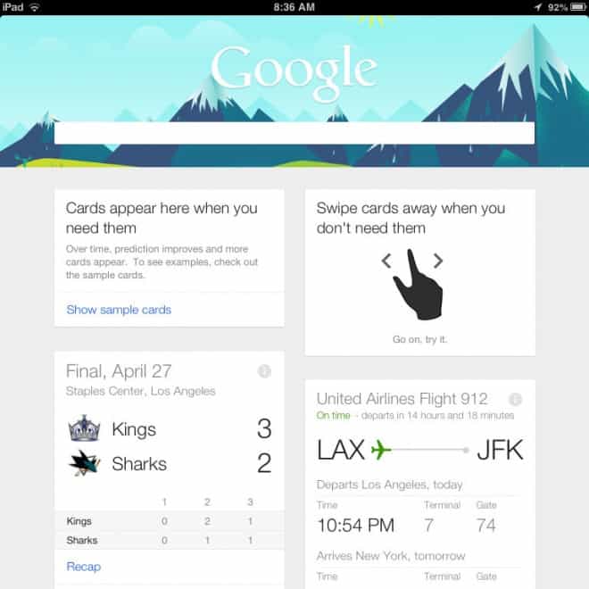 — Cars appear in a small stack at the bottom of the traditional search screen. Touch them and the latest assortment of cards and relevant information pop up full-screen (in my case: flight status, Sharks & Giants scores, stock prices, package deliver). Drag down from the top and you’re returned to the Google search screen. Well designed.