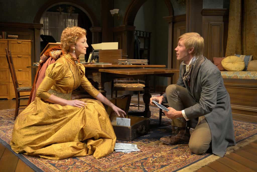 Don’t be duped into thinking that this show about the minister’s wife’s suitors might bear any similarity to that other story (My Fair Lady) based upon a GBS play. Although they share Shaw’s wit, this one is more subtle, more restrained, lacking in the rollicking good humor of My Fair Lady. This musical has other strengths – not the least of which is the voice of Tim Homsley. Homsley, who plays Eugene Marchbanks, has one of the best voices I’ve heard on stage in a long time, ending lines with an unexpected sweetness.