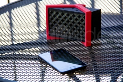 Not content to merely have a unique name, the portable speaker (measuring 4.75 x 2.25 x 2.75 inches) also features a removable silicon band. Fortunately the manufacturer, the Foreign Trade Company, doesn’t require you to make agonizing decisions and includes bands in all three colors – red (as seen in the photos), blue and black.