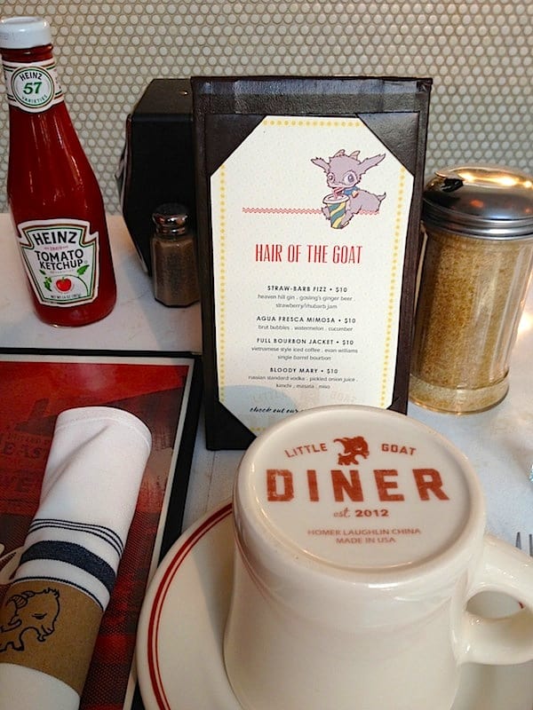 Thankfully I was on the low end of my five pound weight fluctuation when so I decided to take full advantage of my one day in Chicago to explore the fabulous food scene in the trendy, West Loop area. I laced up my comfiest sneaks and headed over to my designated brunch spot, Stephanie Izard’s (the first female to win Top Chef) Little Goat Diner. Swarms of cool kids were chitchatting or sipping coffee as they waited for the hostess to text them that their table was ready. I nabbed the last single at the upscale, old school counter and sipped my bad-ass, Hair of the Goat Bloody Mary, made with a chop-suey mix of pickled onion juice, kimchi, miso and masala, while checking out the humongous plates of food coming off the line. The breakfast-served-all-day menu was broken down into categories like Cereal Killers, Sammiches and Tater Town.