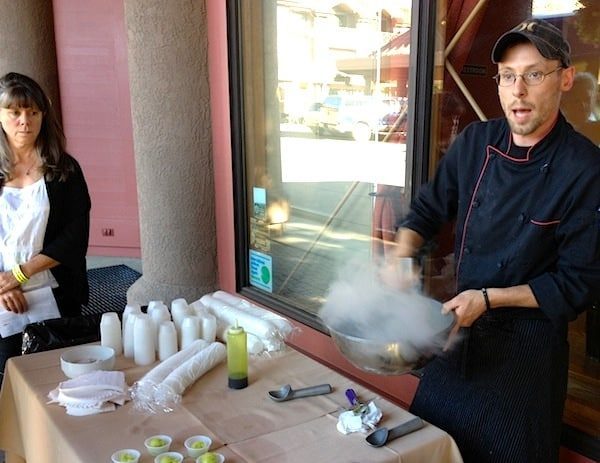 Next up was CavaCava, where Executive Chef, Andrew Nix, was wowing the crowd by magically creating intense chartreuse colored basil and Meyer lemon sorbet by dousing it with liquid nitrogen.