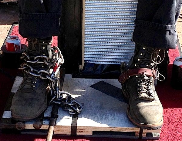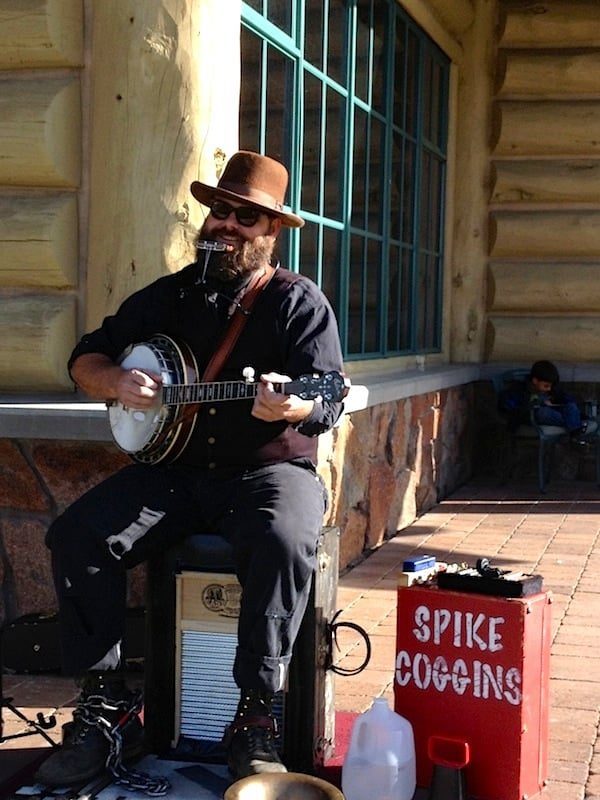 Infectious toe-tapping, body-slapping “primitive” music was supplied by local musician, Spike Coggins, who writes most his own songs about “whatever I’m feeling at the moment” and strums most anything with strings, accompanied by a washboard and his chain-wrapped foot. He’s looking for a good disc blade (used for plowing fields) to add to his “band”.