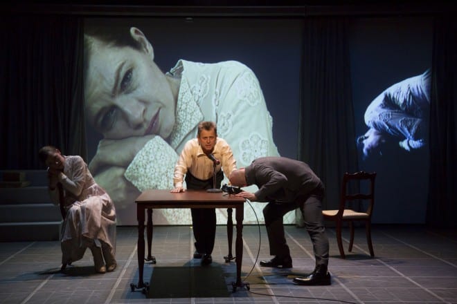 Unfortunately the techno-wizardry mostly dominates. That leaves the actors at the mercy of the machinery, and try as they might, it was evidently difficult during the West Coast premiere for the human side of Chekhov’s short stories from 1898 (Man in a Case and About Love) to connect with the audience.