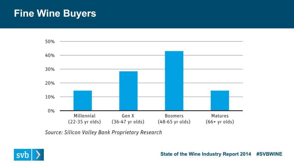 Rob McMillan, who leads the wine division at SVB and authored the report, notes that this year is different. “We believe we are trending to a transition point as Boomers hit retirement and the economic condition of the Millennials replacing them is burdened with high levels of student debt and weak job prospects,” he writes. ” The evolution from Boomers to Millennials as dominant purchasers of wine will prove a significant headwind to sustained growth in the wine business.”