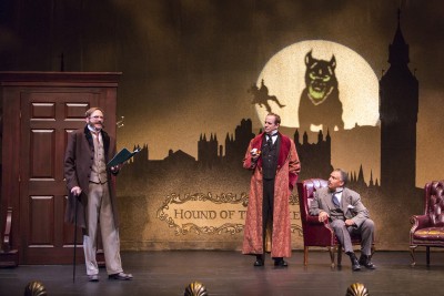 This worked so well because of the enormous talents of Ron Campbell, Darren Bridgett, and Michael Gene Sullivan. Although Campbell’s primary role is Sherlock Holmes and Bridgett’s is Sir Henry Baskerville, these two cycle through so many other roles that you’re not 100 percent who is who unless you see them in bed together. Michael Gene Sullivan remains fixed in the tweedy role of Watson, complete with bowler hat, which he offers up with such deadpan seriousness and superb comic timing that were the others not so strong, he would have walked off with the show.