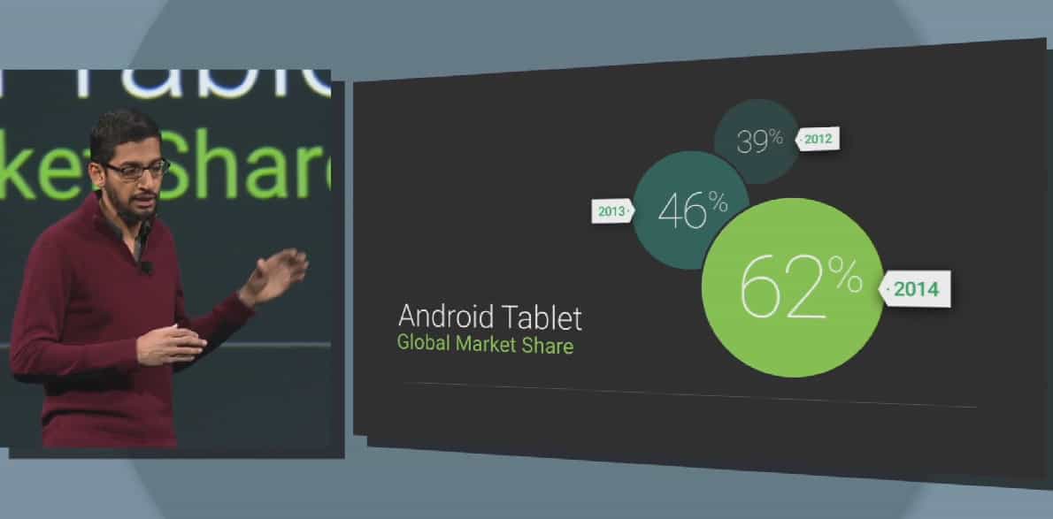 Google continues to make inroads in the tablet market. At the developer conference this morning in San Francisco, Sundar Pichai said that Android runs on 62% of all tablets.