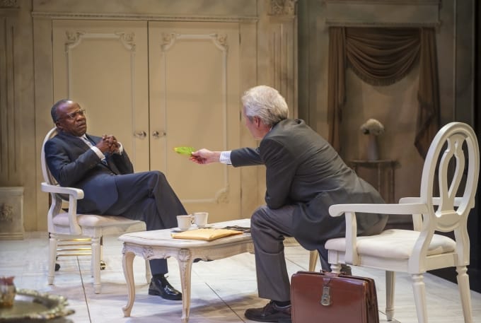 Callender’s considerable acting talents aren’t the only thing that keep you glued to this play. The tone is set the minute Leontyne Mbele-Mbong first walks on stage. So commanding is Mbele-Mbong’s Grace Mugabe, you recognize she’s a fine match for her husband. Exquisitely sensitive to the impact of style, status, and gesture, she lacks the buffoonery that defines her husband – and is all the more chilling because of it.
