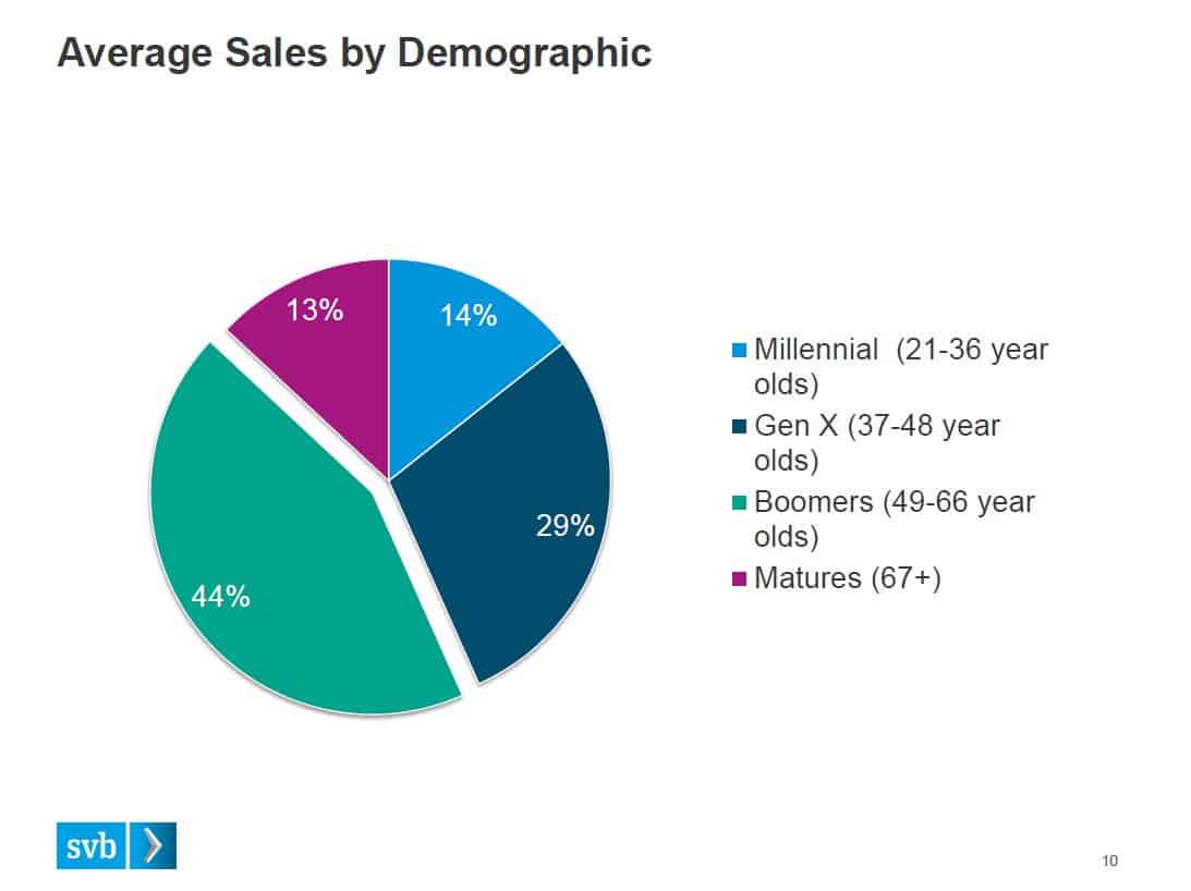 Baby boomers continue to drive the wine market, accounting for 44% of all wine sales in 2014. Gen-X’ers follow at 29%. And, according to the “Annual Wine Conditions Survey” published by Silicon Valley Bank, the three year trend suggests there is little change in this demographic segmentation when it comes to wine sales.