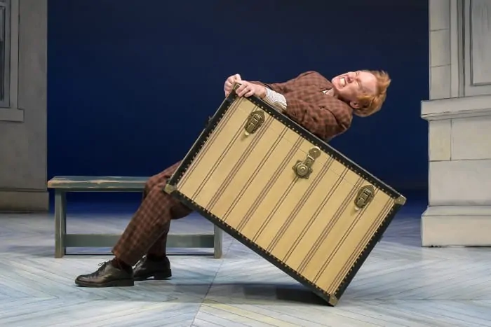 Soon, Henshall (One Man) does find a job. Two of them, in fact. Keeping his bosses (Two Guvnors) unaware of the other becomes a central theme. In one scene, he must serve both lunch at a pub (Pubs that serve food? That’s going to be huge!). He seats them in opposite rooms. As dishes arrive from the kitchen a sort of food ballet ensues — how else to describe this, I’m not sure. Francis Henshall effortlessly orchestrates the proceedings. One moment plating, the next dashing from room to room, balancing soup, and lamb chops, with delightful, manic energy. That he resembles Conan O’Brien, or channels at times Robin Williams, or Martin Short’s Ed Grimley (SCTV/SNL), I’m not sure the reason, his performance works a treat. Reason enough to see this show, multiple times.