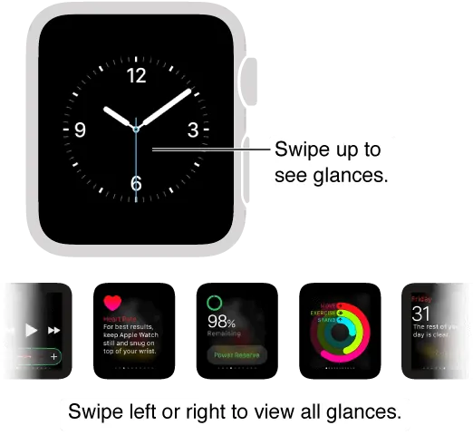 Glances on the Apple Watch are those nifty bite-size pieces of information (“scannable summaries”) that display things like a stock price, step counter, calendar, and current weather. You access them by swiping up, and then you can flip through them left/right.