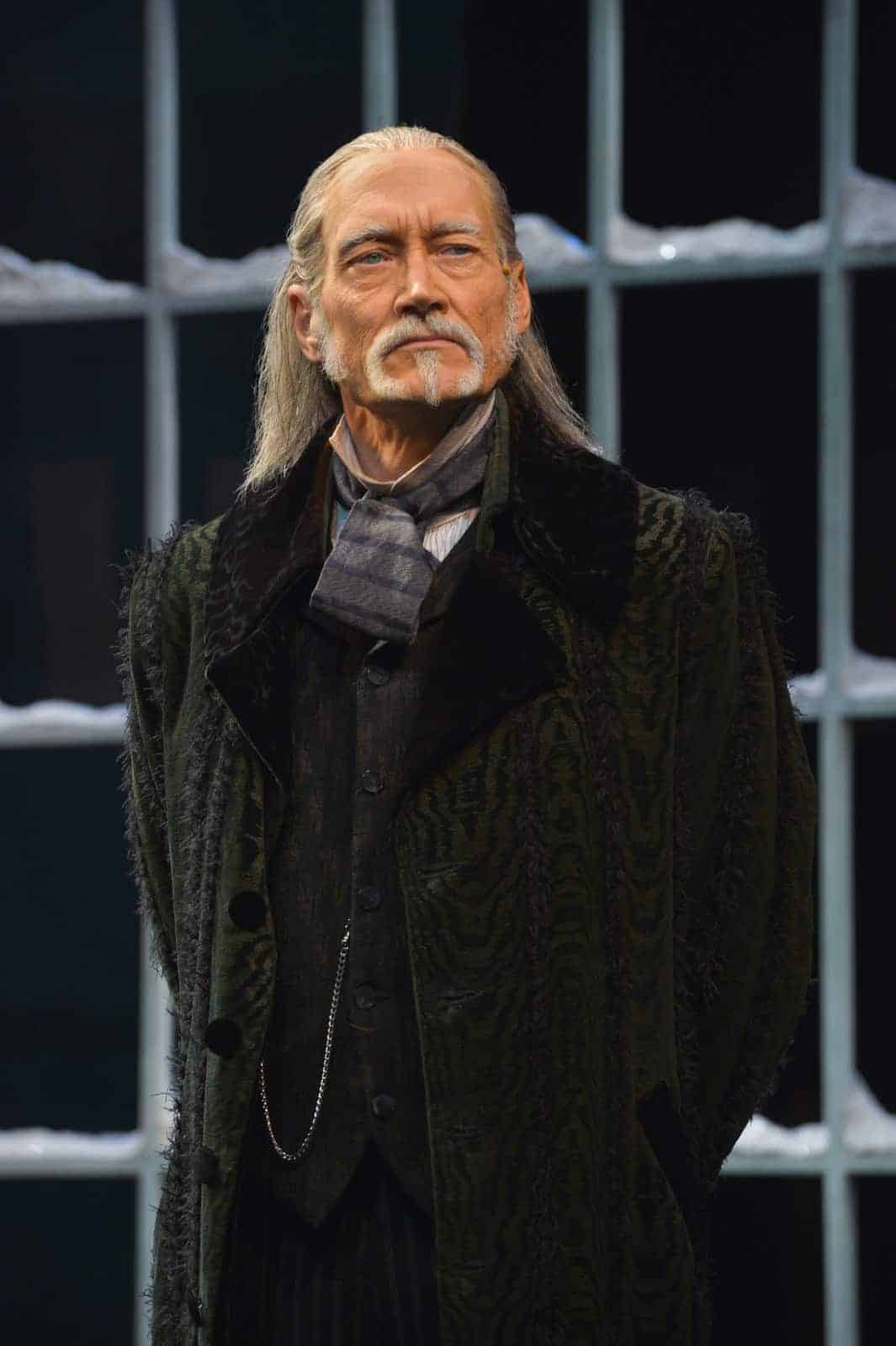 This dramatization of Dickens is a lavish spectacle. Each ghost enters in a different way. Jacob Marley (Scrooge’s former business partner, played by Ken Ruta) appears, laden with chains, through a trap door in the Scrooge’s bed. The Ghost of Christmas Past (Lauren Hart) floats in on a swing, in sparkling fairy-white. The Ghost of Christmas Present (Cindy Goldfield) simply walks onto a balcony, in resplendent green velvet, giggling uncontrollably. The dismal visions of the future shown by the third ghost take the form of a stage-sized black wraith that opens and closes its arms to reveal what might happen on future Christmases.