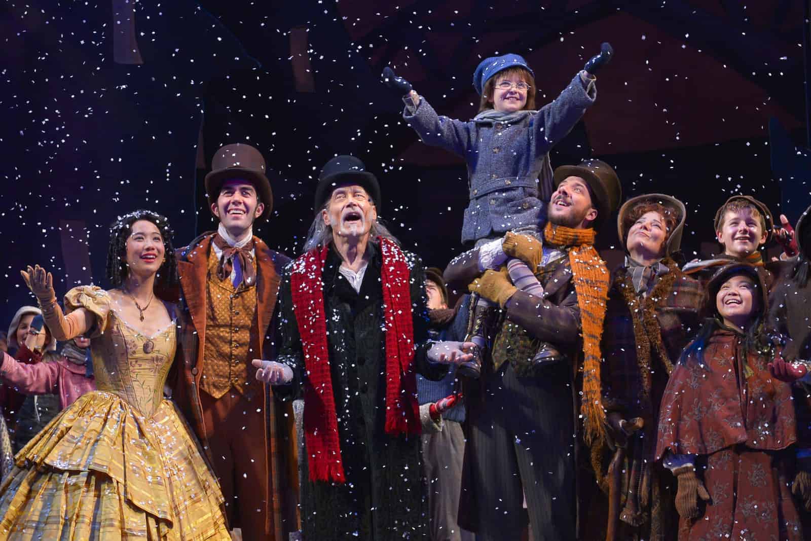 Other aspects of the production are just as dramatic, with floating houses as a backdrop, a ghost flung through a shrinking hole in the curtains, and plenty of sound effects—not to mention musical numbers by Karl Lundeberg and dances by Val Caniparoli. A huge and talented cast supports a production at this scale. The youngest actors make a particular impression, singing sweetly and dancing with energy and precision. Special mentions are due to the French plums, Turkish figs, and Spanish onions, and to Mattea Fountain for her heartwarming performance as Tiny Tim. Among the adults, Nicholas Pelczar’s Bob Cratchit stands out for earnestness and cheerfulness, and Sharon Lockwood’s always-echoing, self-deprecating Mrs. Dilber earns lots of laughs.