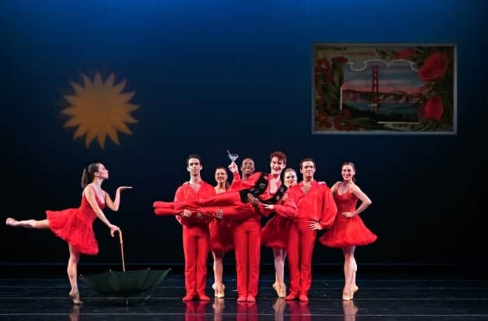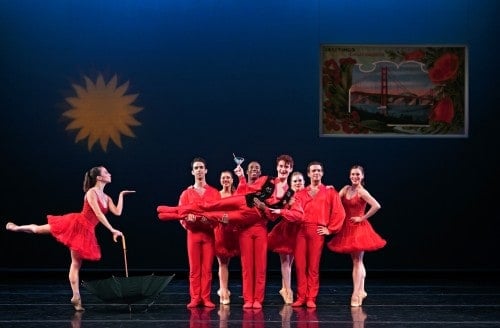 The catch here is that Christmas kitsch is hard to pull off, if only because so much Christmas entertainment is already so kitschy. Act II was strongest when Smuin went full kitsch, as they did with Frosty the Snow Man, performed by Weston Krukow and company dancers tricked out in black trench coats, and Jingle Bells Mambo, danced by Mengjun Chen, Weston Krukow, & Ben Needham-Wood. Red circles on stage drapes that looked suspiciously like Target ads were topped by blue martini glasses to complete someone’s vision of Christmas in a space-age bachelor pad.