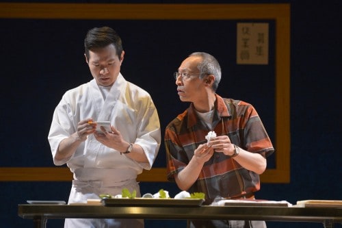 The level of attention to detail lavished on this play, set in Tokyo, immediately recalled Jiro Dreams of Sushi, the 2011 documentary that consistently tops Netflix most-viewed lists. Jiro is, of course, about Sukiyabashi Jiro, the 85-year-old sushi master and owner of a ten seat, 3-star restaurant in Ginzi subway station, superficially, at least similar to Koji Sushi, the restaurant at hand.