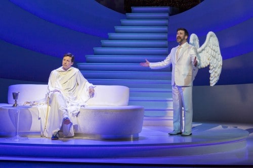 Scott Pask’s divine scenic designs and Hugh Vanstone’s lighting designs resolved the thorny problems inherent in getting the spatial relationship between heaven and earth right. This god is cast in a luminous glow to which current candidates can only jones.