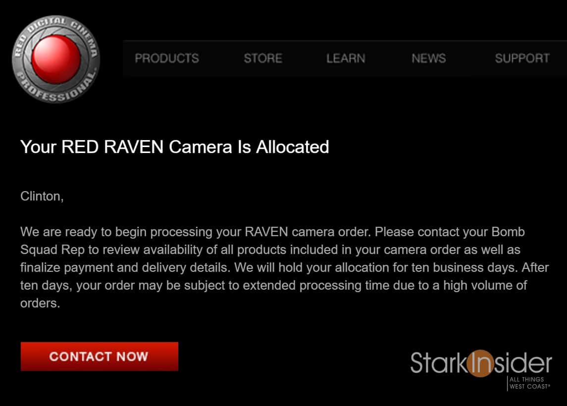 Yesterday I received the much ballyhooed (at least amongst the REDuser community) “allocation email.” The brief communication simply means a camera, in this case a Red Raven, has been allocated in my name, and will ship shortly: