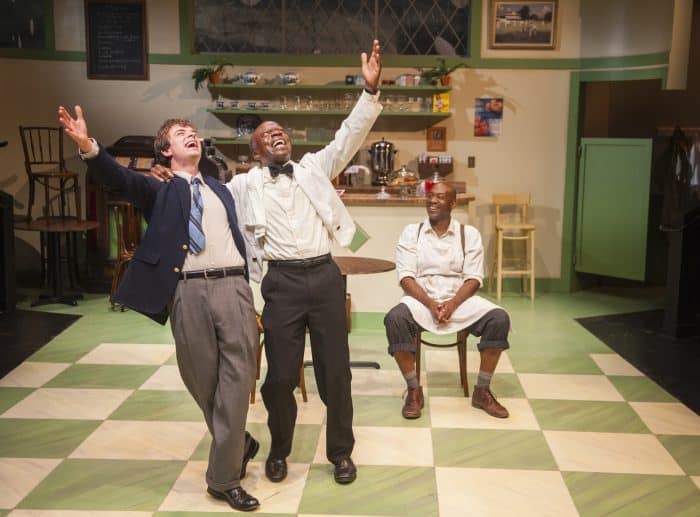 Athol Fugard’s play was banned in his native South Africa where it is set, so its 1982 premiere took place in New York instead. At first, it’s hard to see why. Willie and Sam chat and joke and dance as they clean the tea room where they work. Their white employer’s son Hally (Harold) drops by after school. With a mix of collegiality and condescension, he reminisces with Sam about his younger days. Sam and Willie teach Hally the beauty of ballroom dancing, “a dream about a world where accidents don’t happen,” unlike the real world where “no one knows the steps… [there are] big collisions, and they make a lot of bruises.”