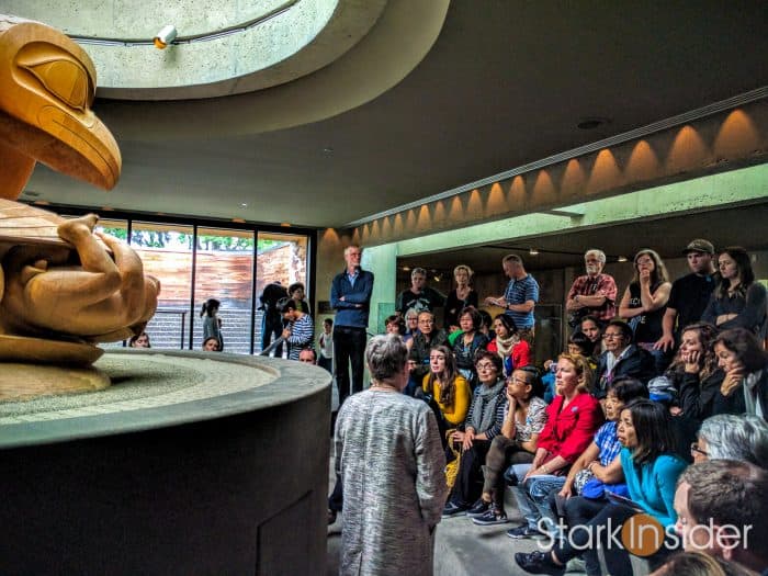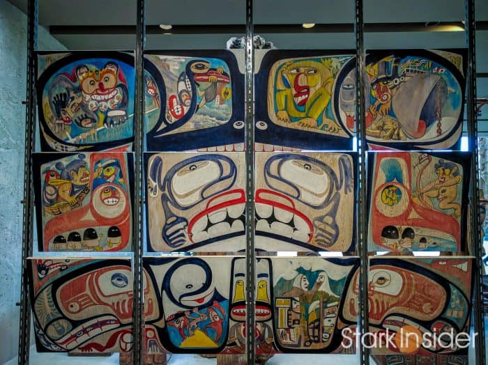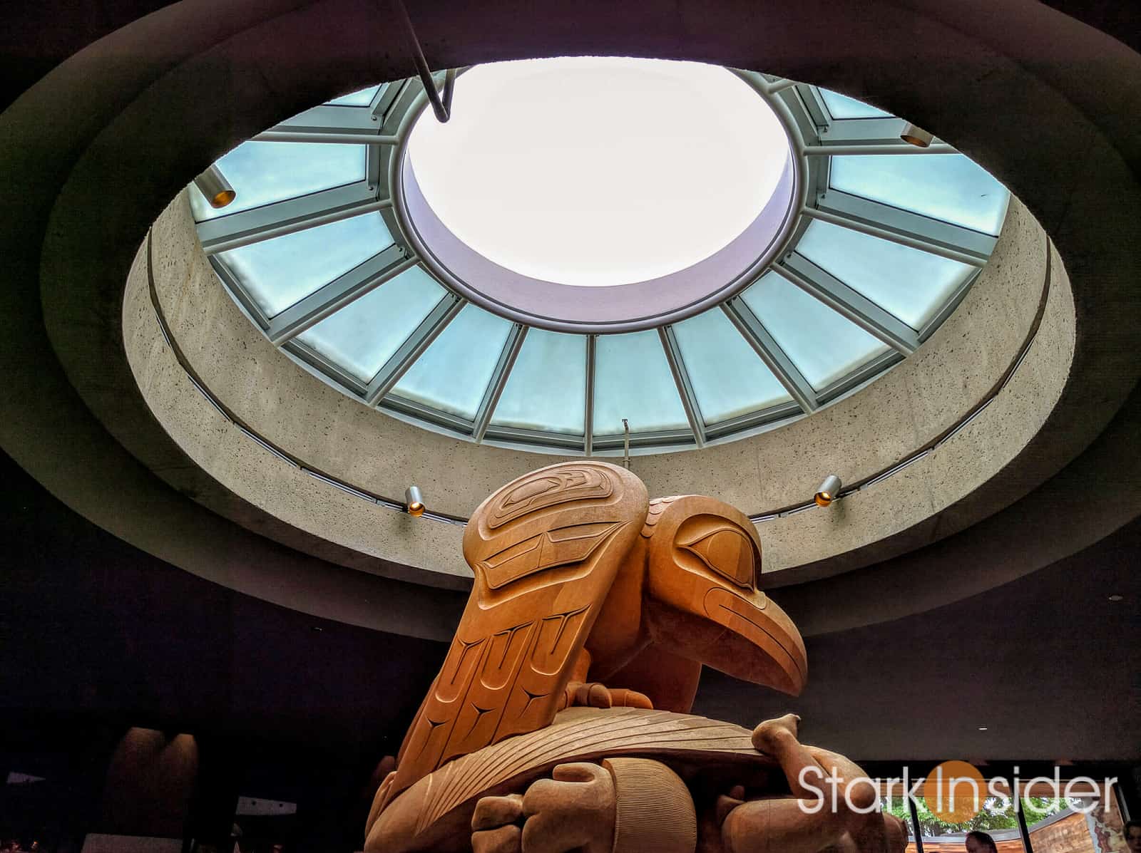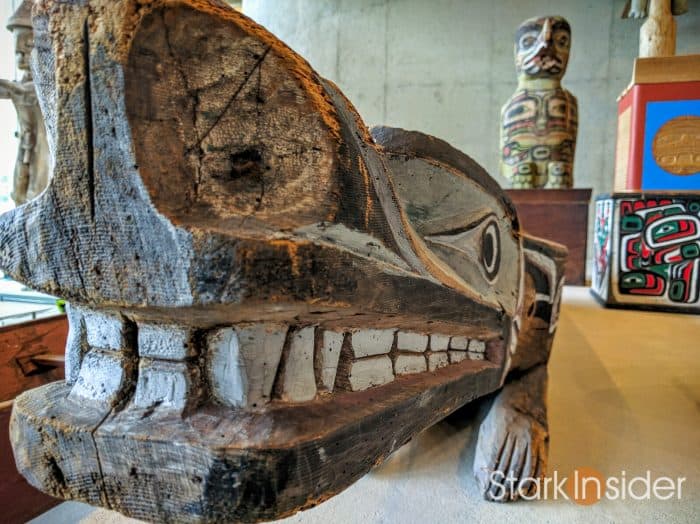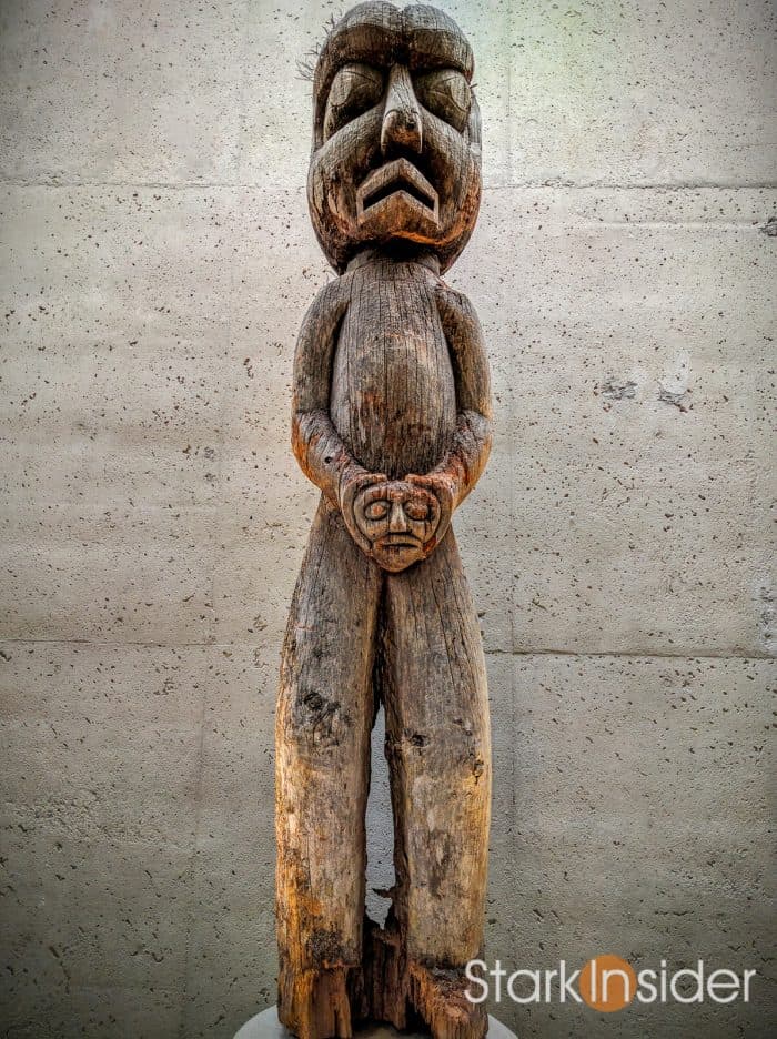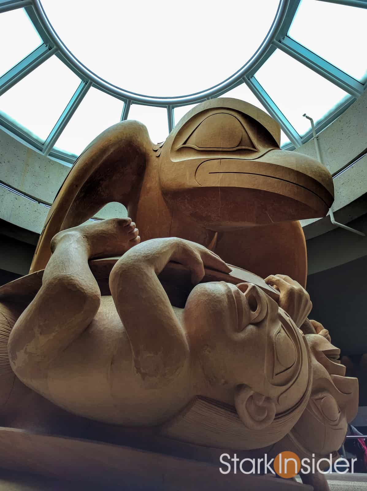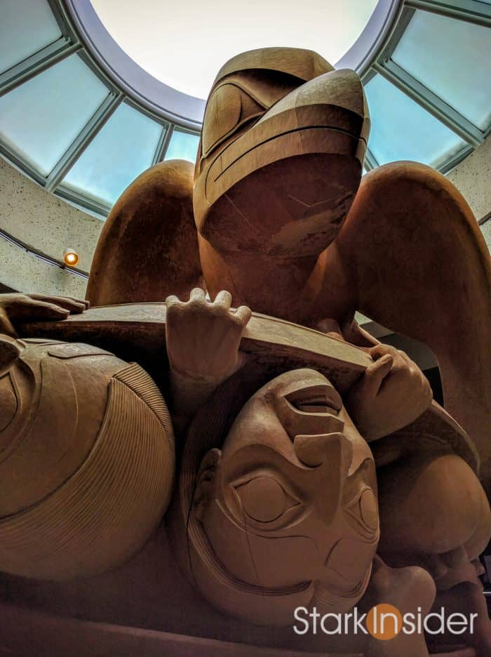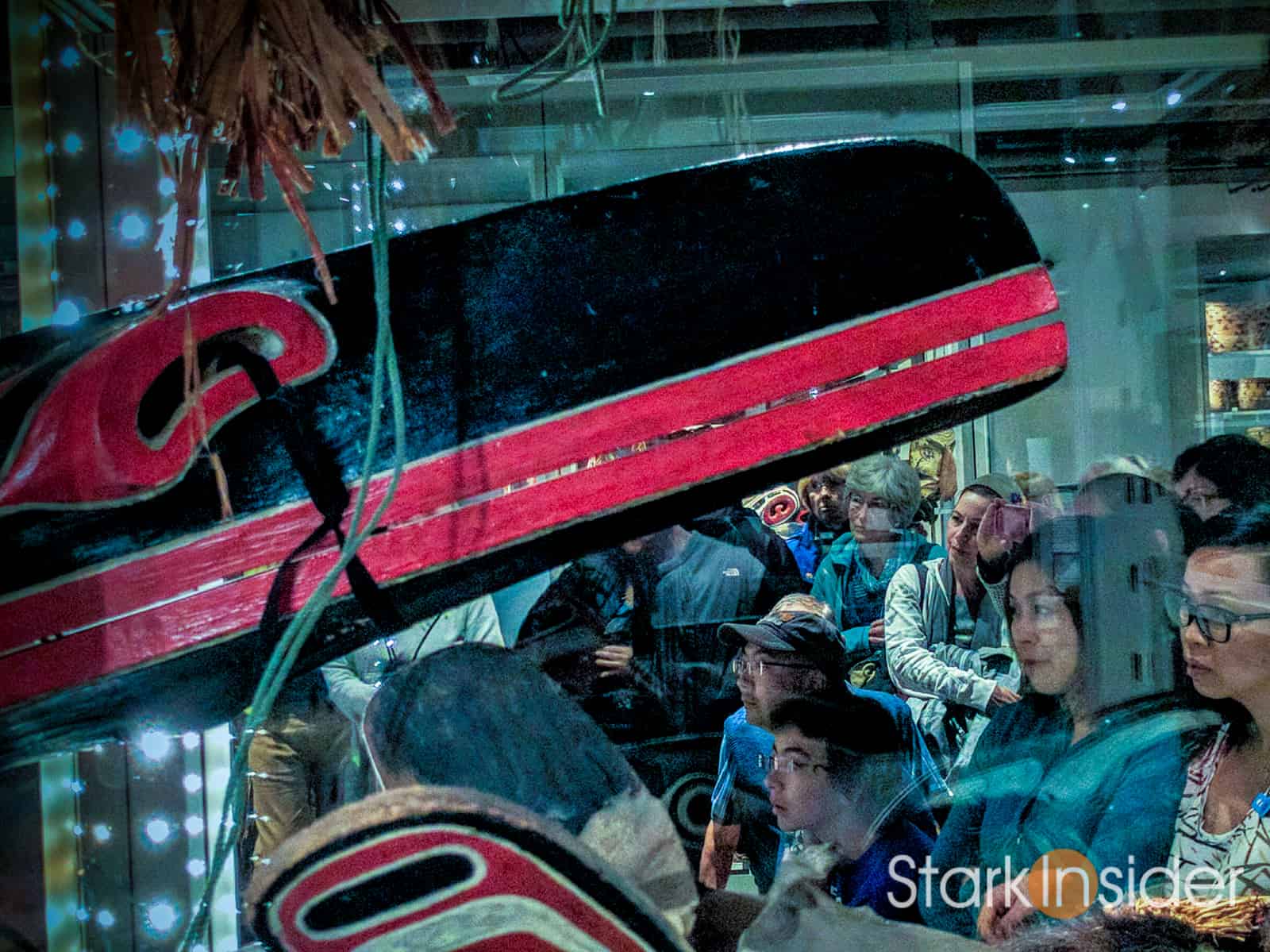 As storm clouds loomed above, I made my way from the main lobby into an airy hall that houses carved figures, and along the floor to ceiling glass at the rear, totem poles, some that reach 40-feet into the air. Towering above me, you could not help but feel captivated by the hearts and minds of the First Nation people.