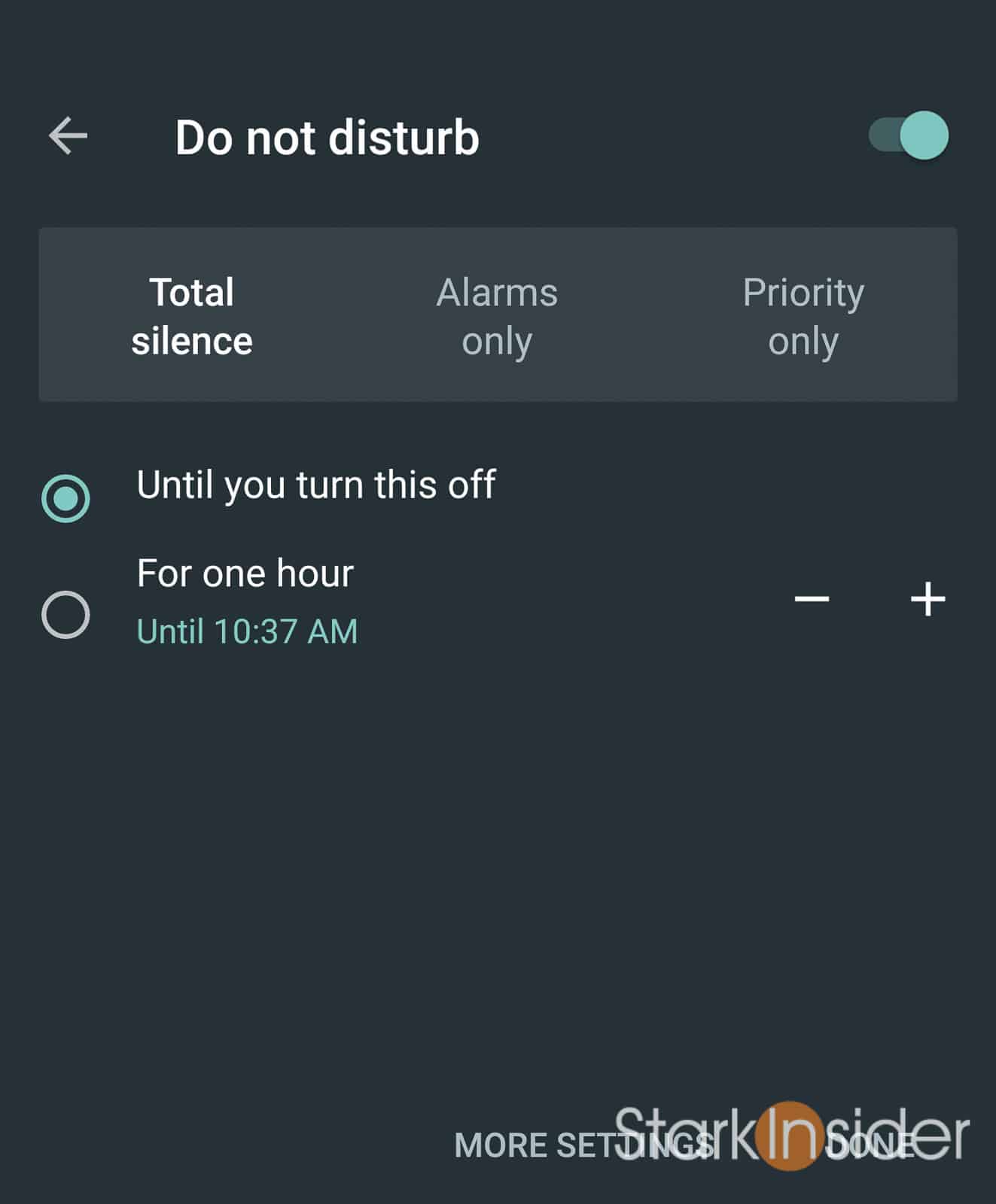 With Android N, we now have three options: Total silence, Alarms only, Priority only. Once again, you can activate these moments until you turn them off, or, if you’re in a meeting for instance, you can put your phone into silent mode for an hour.