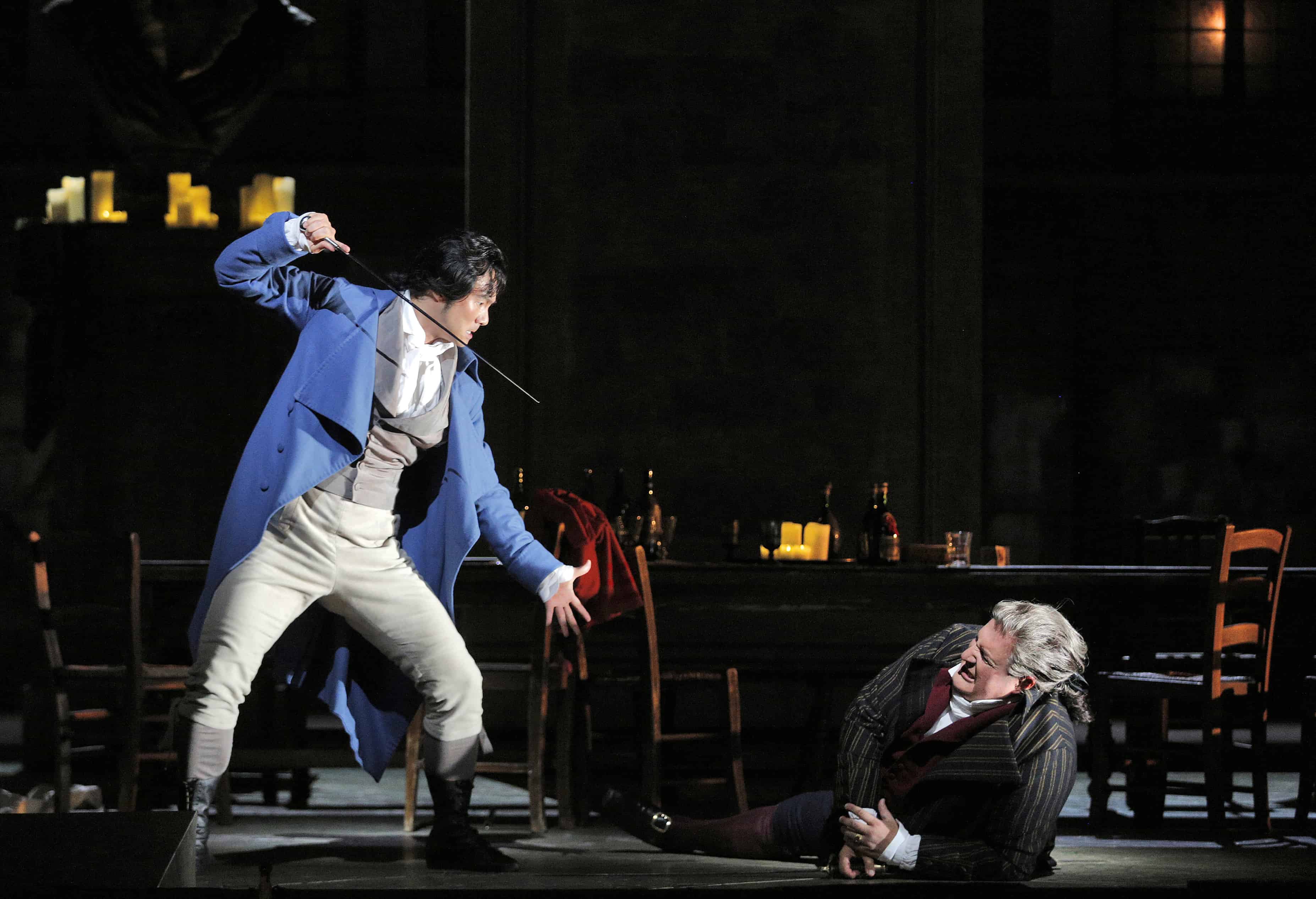 David McVicar’s production is traditional and opulent. Every detail is just right, from the graffiti on the walls to the lighting of the chandeliers and streetlamps. The blood-dipped tricolor curtain sports Robespierre’s comment on Chénier’s death warrant: “Even Plato banished poets from his Republic”. The costumes (by Jenny Tiramani) could be a museum exhibit of late-eighteenth-century dress styles. What the singers do on the stage doesn’t always convince—there are a few misfires that cause head-scratching (a mob held back by a couple servants and Gérard’s half-hearted attempt to grab Maddalena come to mind)—but there’s never a shortage of beautiful things to look at.