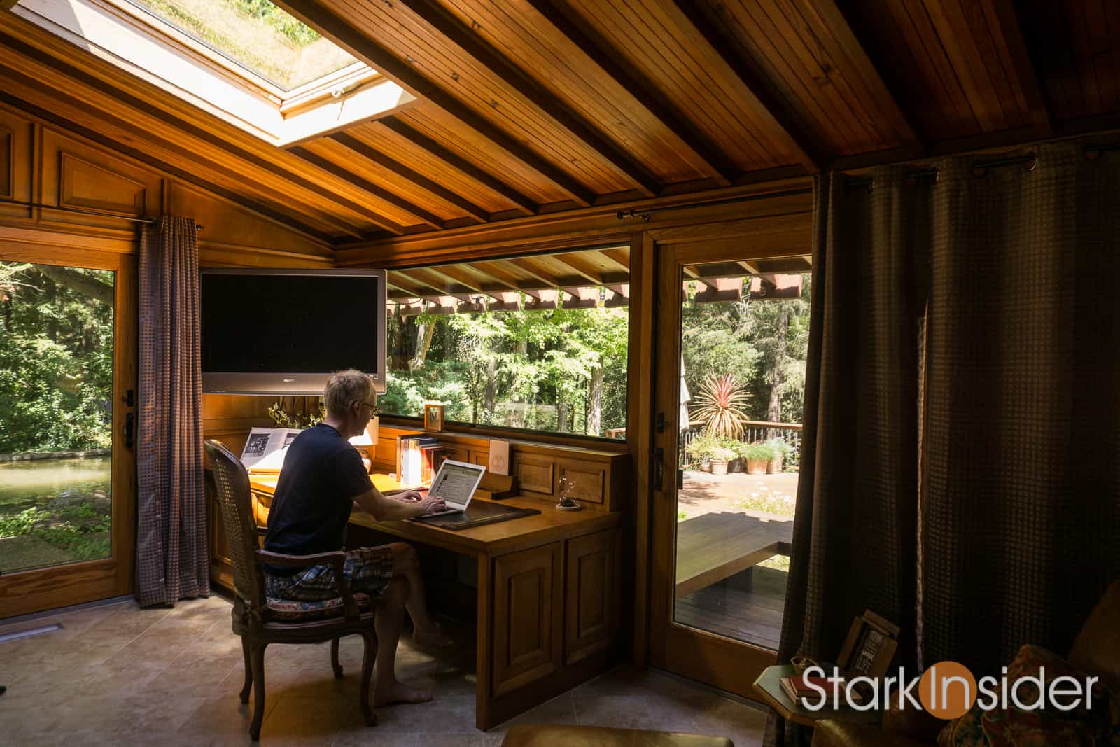 As an aside, I loathe being in front of the camera. But there were only two of us. No actors happened to be hanging around this “hidden cabin of famous cartoonist” in Sebastopol, so we made do.