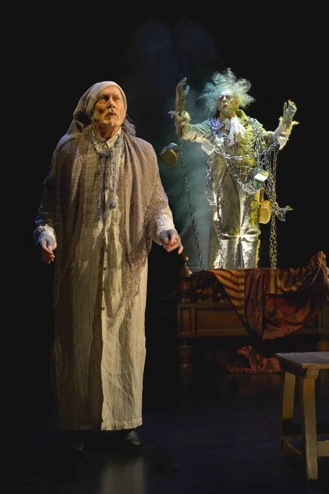The wealthy miser Ebenezer Scrooge (James Carpenter and Anthony Fusco) is stern and unforgiving with his mild-mannered clerk Bob Cratchit (Nick Gabriel). Giving employees a paid holiday to celebrate Christmas seems wasteful in the extreme, from Scrooge’s point of view. “What right have you to be merry? You’re poor enough!” He has no patience with impoverished urchins – debtors’ prison and the workhouses exist to deal with them. We see him berating his housekeeper (Sharon Lockwood), and rebuffing his nephew’s good wishes (Albert Rubio). On the night of December 24th, however, the ghosts of Christmas present themselves to Scrooge in ways he cannot ignore. The first ghost is that of his late business partner, Jacob Marley (Ken Ruta), wonderfully imagined, popping out of the grave. The ghost of Christmas past is a radiant Emily Brown dressed in silver and seated on a high swing. And the ghost of Christmas present is a charismatic hostess richly garbed in green with a royal staff in hand (Catherine Castellanos).