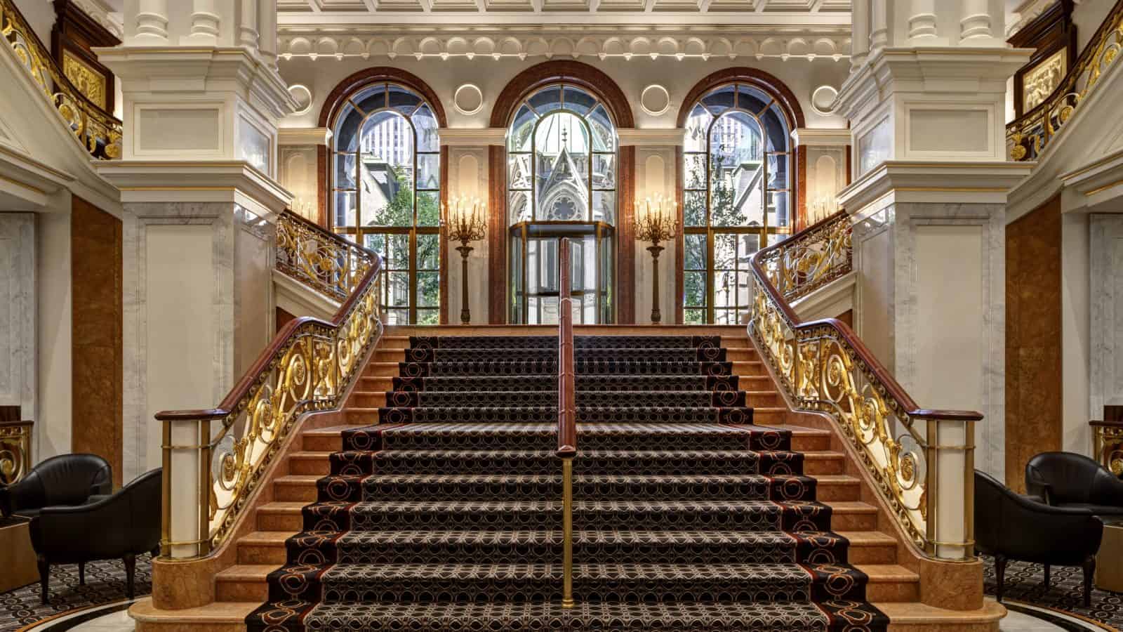 The Gatsby-like lobby is filled with elegant Tiffany stained glass windows, gilded ceilings, and a sweeping grand staircase, lovely leftovers from 1882 when it was a private mansion for financier Henry Villard.
