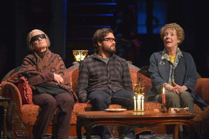 John contains four fascinating, complex characters. Mertis (Georgia Engel) is a quirky bed-and-breakfast owner with too many tchotchkes and morbid eloquence. She gets the best lines, from her deadpan introduction of the portrait in the breakfast nook (“that’s Eugenia”) to comparing her (ex-)husbands to a woodchuck and a prehistoric fish. Her blind best friend Genevieve (Ann McDonough) has an equally outsized personality. The highlight of the show comes when she postpones intermission to deliver an exuberant, fourth-wall-breaking monologue about going clinically insane.
