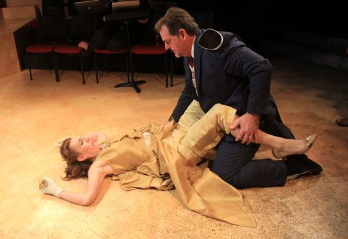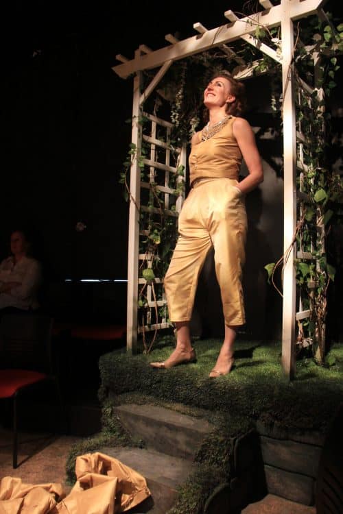 A fiercely committed cast rescued the show from boredom. Cecily Schmidt’s excellent Aricia was more spunky than love-struck, and she had adorable chemistry with both her servant Ismene (Maria Leigh) and her lover Hippolytus (Ed Berkeley). Courtney Walsh gave a command performance as Phèdre, creating a sustained and varied portrait of madness. This was no noble heroine with a bad advisor and a fatal flaw. From the moment we first met her, she was unmoored, flinching, humming, covering her ears to avoid bad news, and even masturbating onstage.