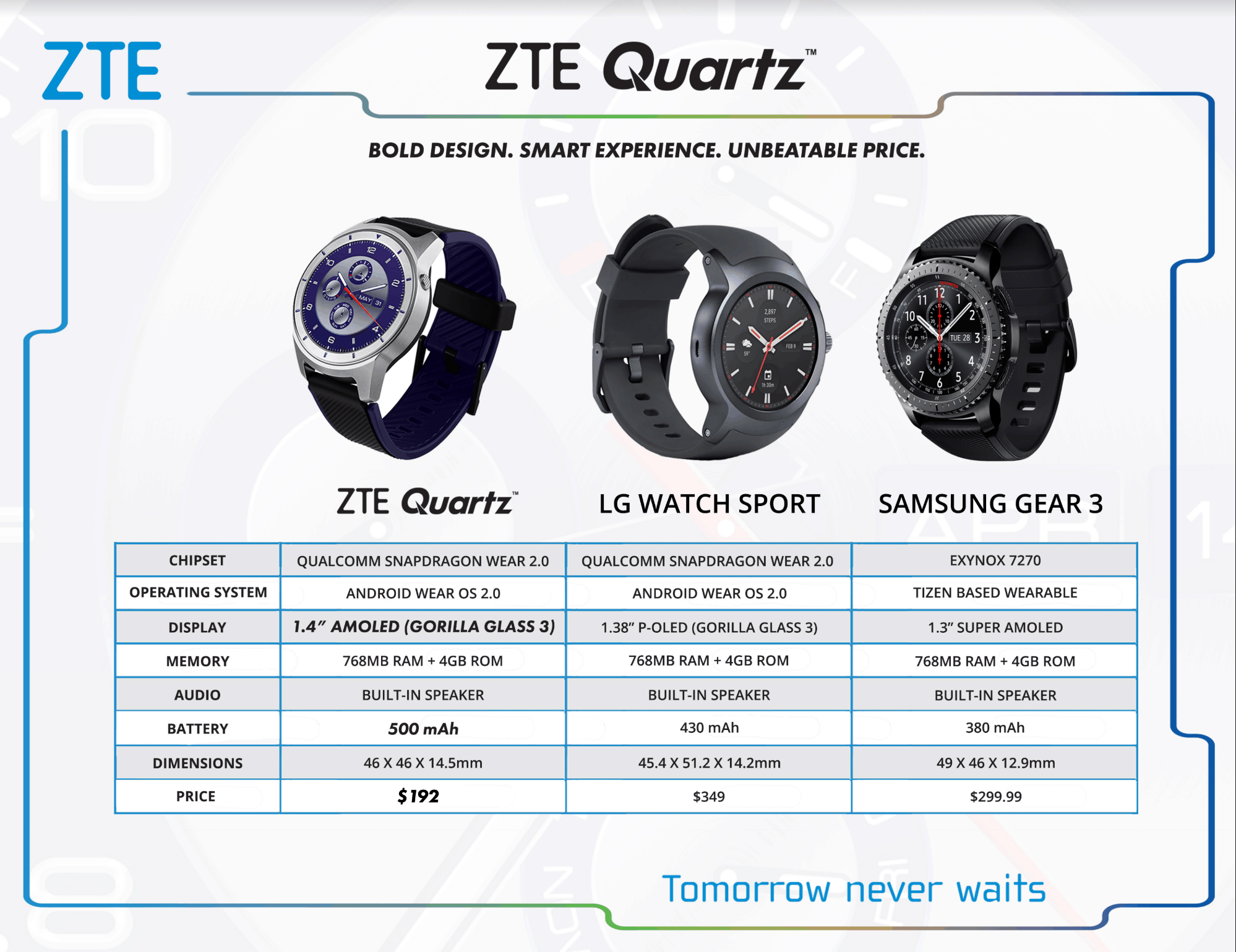ZTE provided this chart as part of the press release which shows the Quartz compared to some of its key rivals, the LG Watch Sport and Samsung Gear 3:
