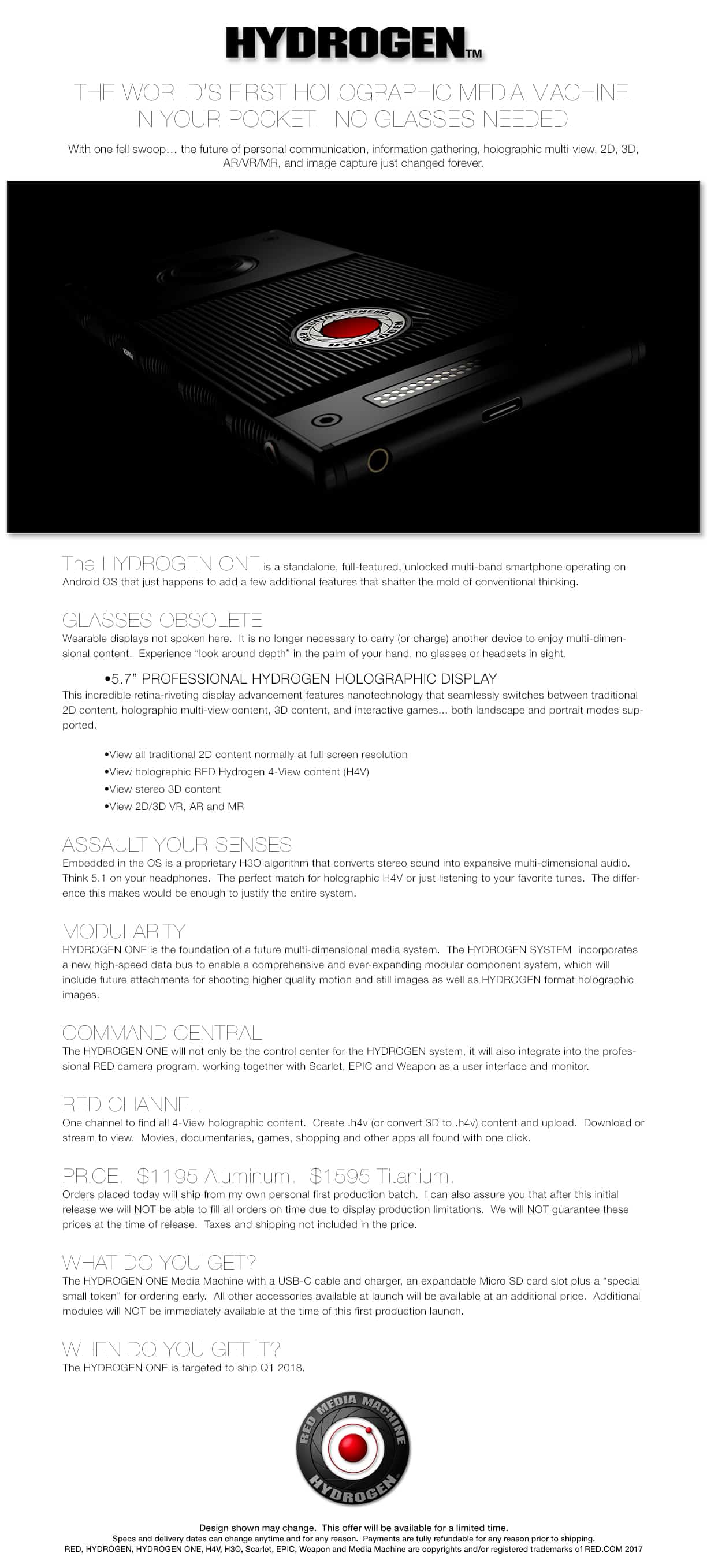 Hydrogen One is a phone, sort of. It’s also a holographic playback device (plus 2D, 3D, AV/VR/MR). And, it looks like it will feature a modular design (like RED cameras) that will enable it to shoot high quality video footage handheld in a package not much bigger than a smartphone. In early marketing materials RED is calling the military grade looking device a “Holographic Media Machine”: