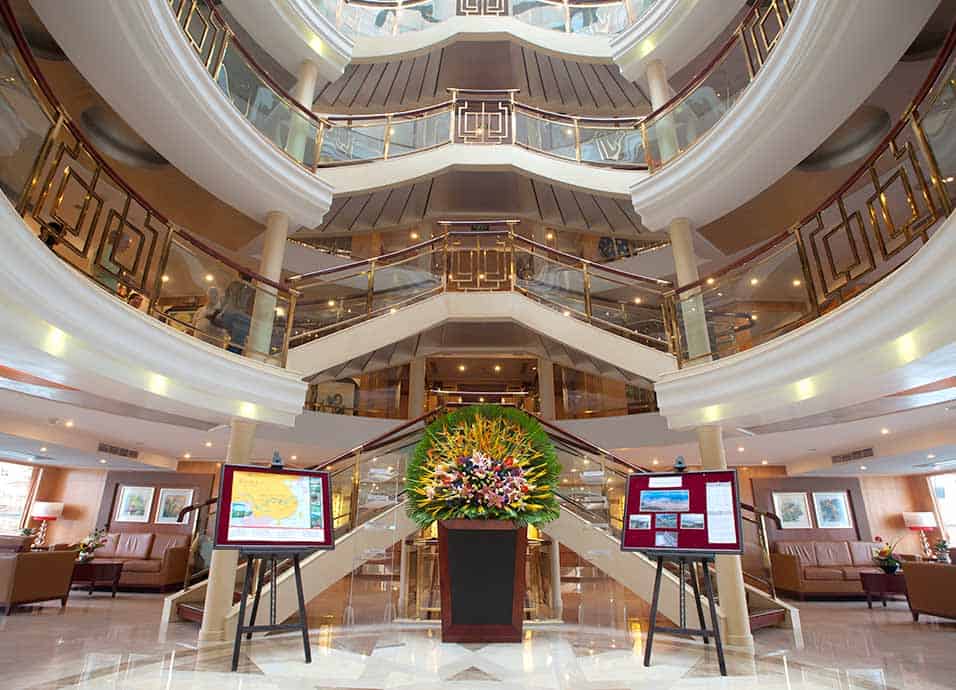 I was a little disappointed when I saw the plain-Jane exterior of our boat, the 256-passenger Emerald, which is charted by Viking. However, upon boarding the boat, when we were greeted by a prancing red Chinese Dragon, chilled tea, and cool wet cloths, I let out a sigh of relief as I saw all the familiar Viking touches: sophisticated floral arrangements, a dramatic glass lobby, roomy sundeck with plenty of shady spots, internet café, library, helpy-selfy coffee tea and pastry counter, copious L’Occitane bath products, and bright spacious staterooms.