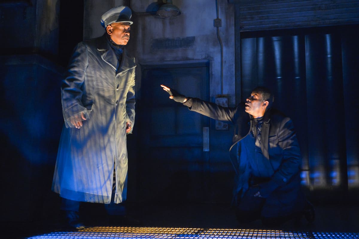 Director Carey Perloff states that her concept for the show was driven by the frequent textual references to rot and corruption. Inspired by images of post-nuclear sites, she and set designer David Israel Reynoso have created a warehouse onstage. Mold creeps up industrial-looking walls, and a giant garage door crashes open to let the players in. For court scenes, translucent curtains and a mid-century chandelier soften the vibe. The veneer of civilization is thin and easily swept away. The weapons of choice are brutal: short sticks with sharp spear heads, wielded (in a thrilling duel choreographed by Jonathan Rider) in a mix of baton- and knife-fighting styles.