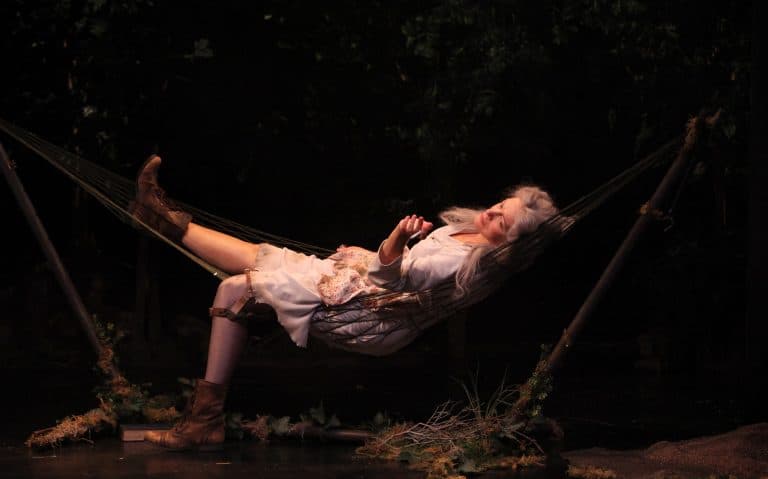 The Eva Trilogy comprises Eden, a one-woman show in which we learn Eva’s history and the choices she makes when caring for her dying mother; Enter the Roar, in which four characters who knew Eva struggle to make sense of her actions; and No Coast Road, a thirty-years-later encounter between Eva (now a “wild woman” in the Corsican hills) and a lost hiker. Together, they’re a lot to absorb. Hammond drops us into each scene mid-stream, trusting us to figure it out. Monologues and conversations take sudden sharp turns, and throwaway comments provide important information. It requires effort to keep up.
