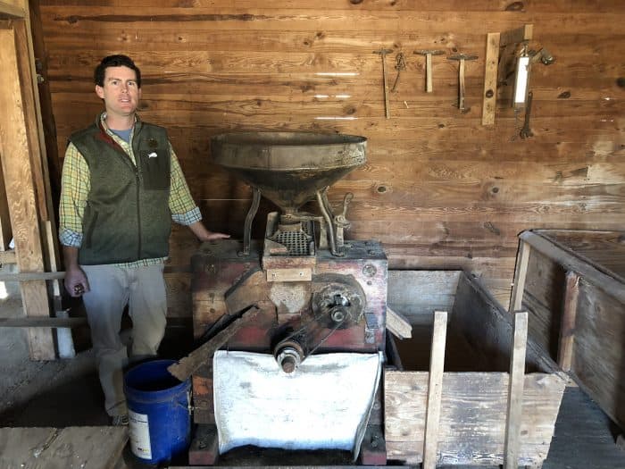 Cooper took us all around the property us, showing us the old blacksmith shop filled with original tools, the first cotton gin in the log seed house, a carriage house, a potato house with a pit for the storing vegetables, the weaving house, a canning house, the overseer’s house, tenant quarters, a firehouse with a 1930s fire engine, and a two-story early Federal/Greek Revival style house with clapboards covering the original log structure (Cooper’s home).