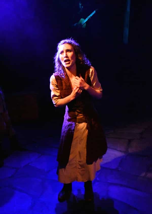 The voices, too, are best en masse. For “Little Bird” and the finale, the company sang in perfect, shimmering harmonies. Many of members of the ensemble showed off gorgeous voices in solos: Shelby Stewart’s energetic belt as the Barber, Jenny Matteucci’s operatic mezzo as the Housekeeper, Emma Nadine Onasch’s legit soprano as Antonia, and Jack O’Reilly’s warm croon as the Padre. The leading characters did not fare so well, and were the show’s greatest weakness. The role of Sancho Panza sat too high for Dave Leon, whose sweet voice turned into a flat bellow on top notes. In other respects, he was perfect for the part, with a humorously doltish characterization and great euphonium playing. As Aldonza, Rachel Richman showed deep feeling but a weak voice that lagged the beat and shook on high notes.