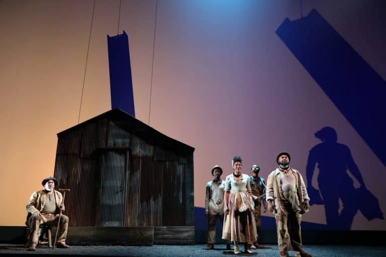 Appropriately, staging elements refuse to stay rooted in the nineteenth century. A “forest” of steel girders and yellow-red lighting set a post-apocalyptic vibe for part 2, which takes place near the battlefield. Hoodies and “hands up, don’t shoot” poses evoke twenty-first-century examples of violent racism. Director Liz Diamond creates beautiful tableaux with shadow silhouettes and carefully choreographed blocking. There are long stretches where the stage action feels static, with only the energy of Suzan-Lori Parks’ words to keep up the play’s momentum.