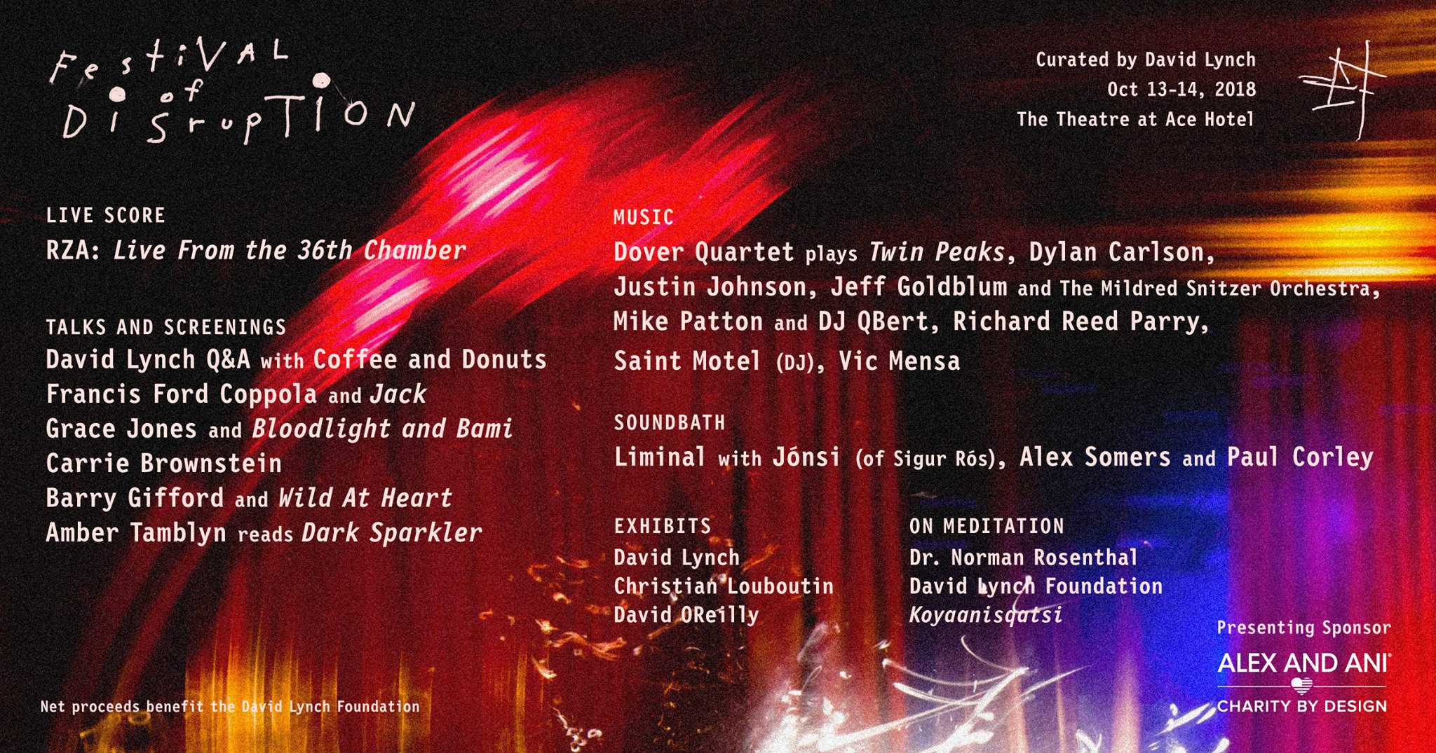 It’s happening again. David Lynch has revealed the lineup for the next Festival of Disruption. Read on for the details here on Stark Insider. And don’t forget: keep your eye on the donut not on the hole.