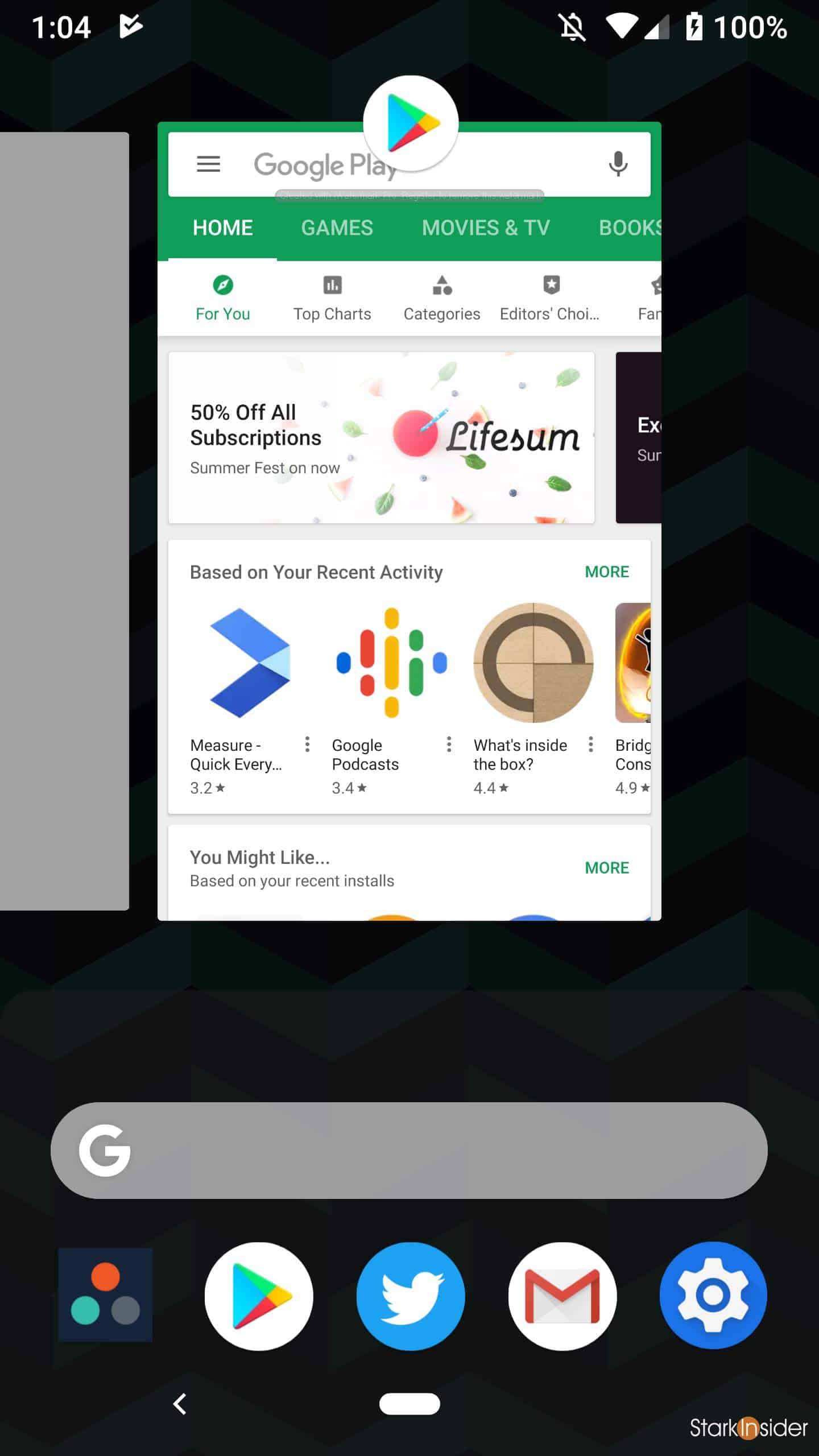Swipe partially up for access to recent apps, search bar, and 5 apps that Google thinks you might want to access at that particular moment.