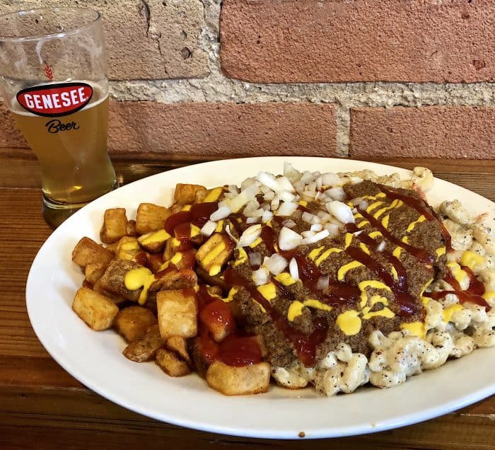 I loved their IPA with an order of Bavarian Pretzels dipped in beer cheese sauce but I honestly think you have to be born here to appreciate their “Garbage Plate”, Rochester’s signature dish, It’s a conglomeration of macaroni salad, beans, tater tots, onions, mustard and ketchup, topped with your choice of protein (the locals prefer cheeseburgers or hot dogs) liberally doused with a meaty hot sauce!