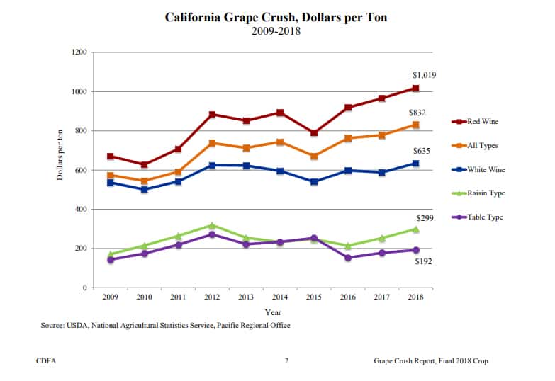 “In 2018, Chardonnay continued to account for the largest percentage of the total crush volume with 15.8 percent. Cabernet Sauvignon accounted for the second leading percentage of crush with 15.1 percent. Thompson Seedless, the leading raisin grape variety crushed for 2018, was only 1.5 percent of the total crush.”