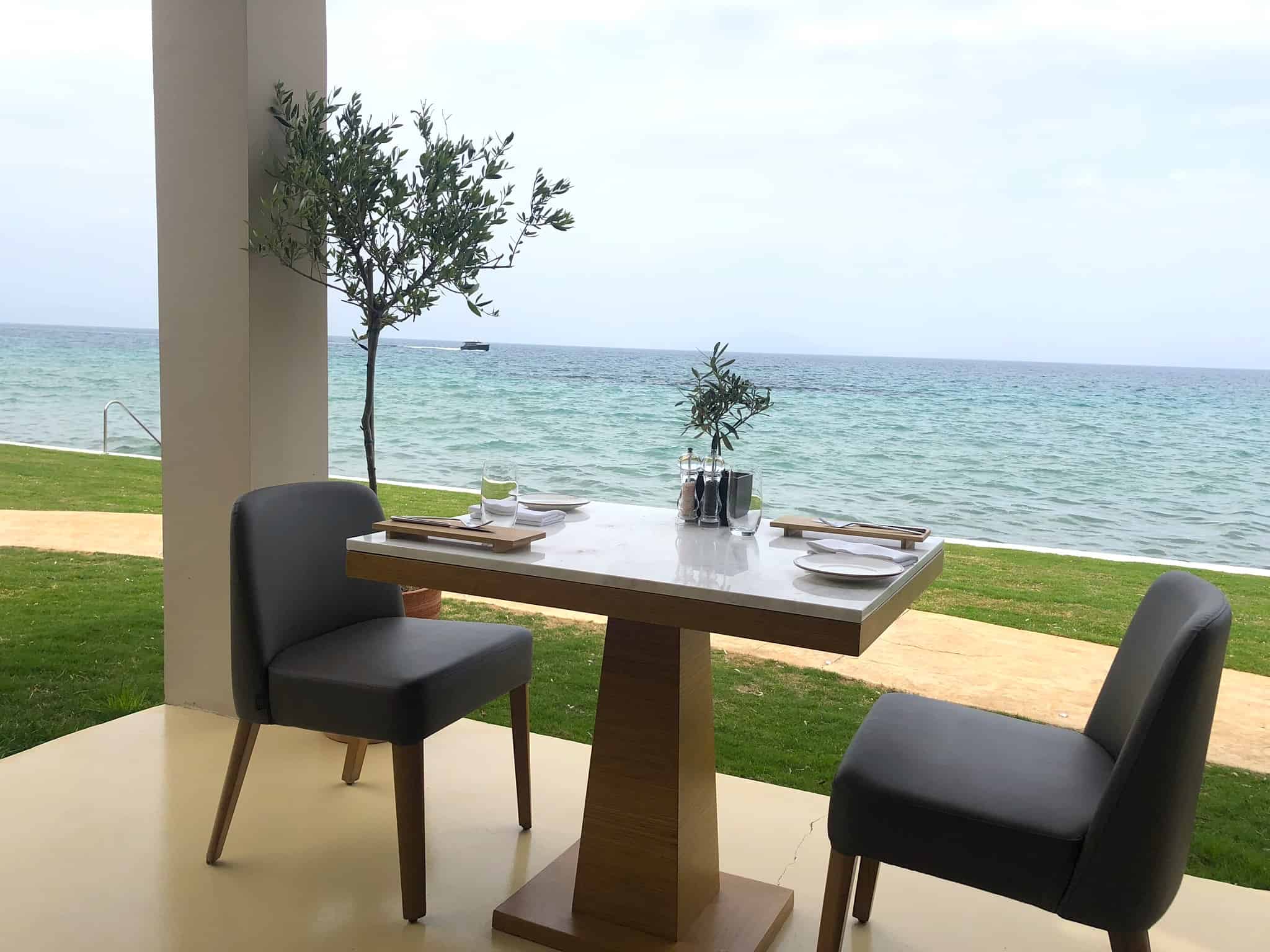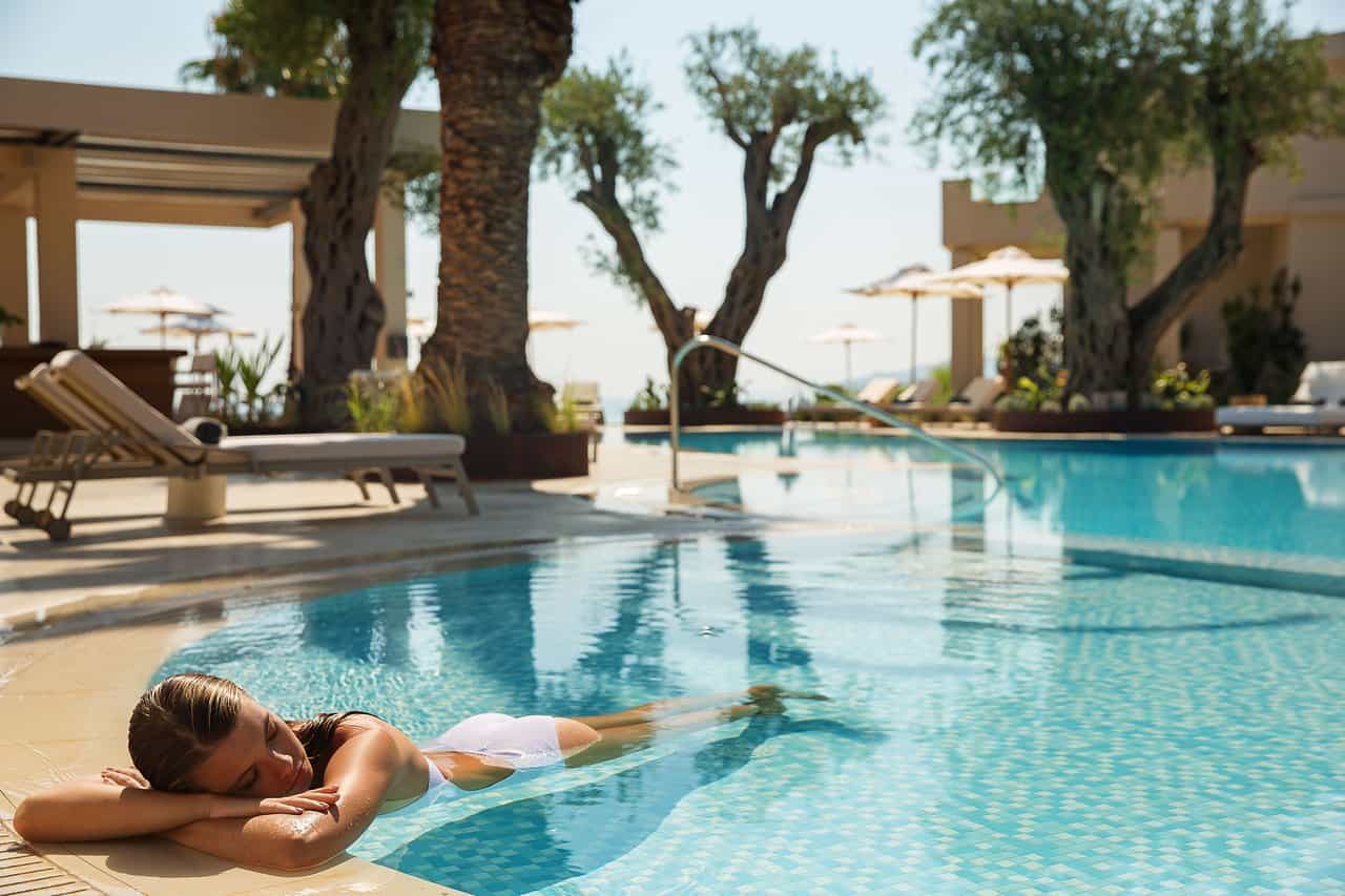 1. The Domes Miramare resort is in Moraitika, on Corfu’s east coast, about a 30-minute drive from your villa. Originally designed by architect Charalambos Sfaellos, it served as the summer playground for the Onassis family in the 1960s before undergoing an extensive muti-million dollar renovation after becoming part of the Domes Resorts family. As a nod to its famed history, the designer kept the 200-year-old, twisted olive tree growing right through the center of the stunning lobby.