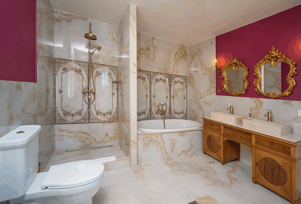 The 3-story villa’s first floor is made up of a living room, where you’ll find a dramatic mirror, a replica of the grand mirror of Althorp Castle, overlooking a massive 10-person dining table, and a fully-equipped kitchen if you’re dying to impress your friends with your culinary skills.