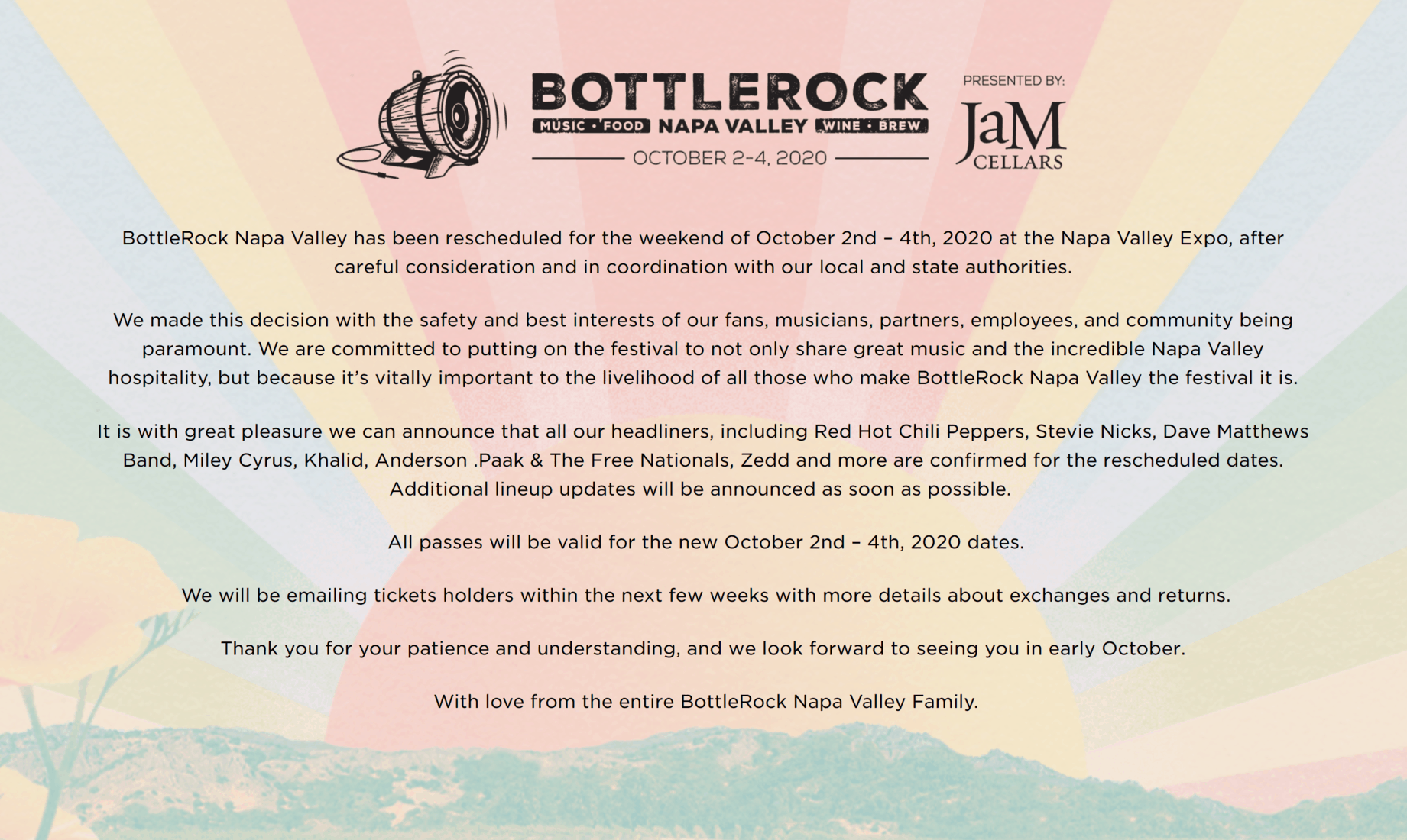 We made this decision with the safety and best interests of our fans, musicians, partners, employees, and community being paramount. We are committed to putting on the festival to not only share great music and the incredible Napa Valley hospitality, but because it’s vitally important to the livelihood of all those who make BottleRock Napa Valley the festival it is.