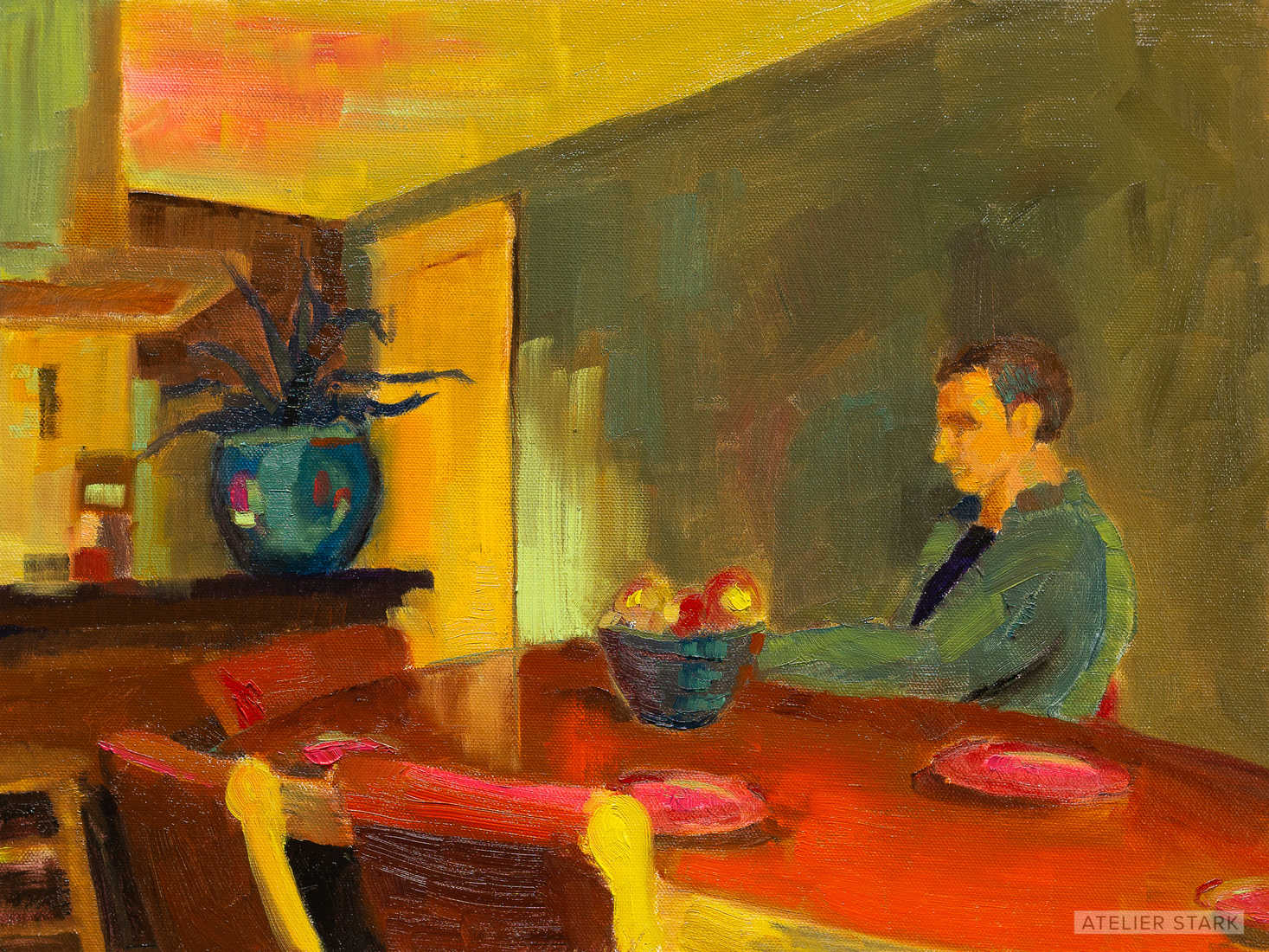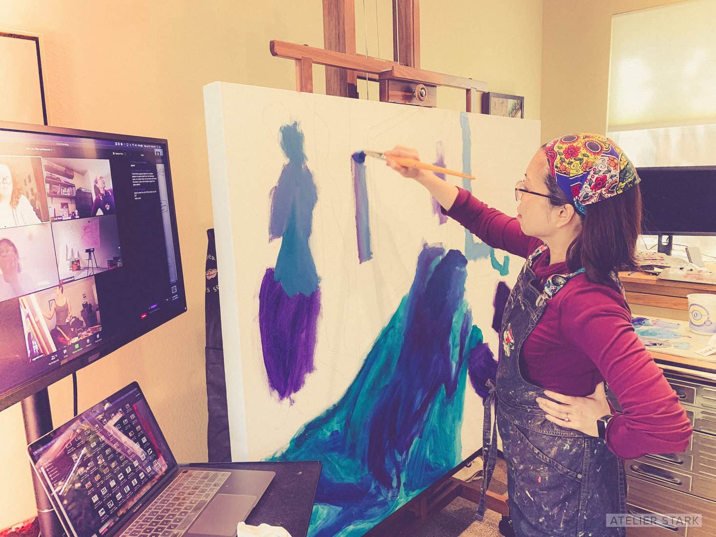 Firstly, I was able to devote even more time to my art; no longer bound by the time the school was open. I could roll out of bed, make my turmeric and ginger tea, stumble into my home studio and continue to paint from early morning well into the evening. The collaboration platform used during the marathon enabled every artist to upload their process photos and finished paintings and I was able to spend more time studying fellow works and how they dealt with the challenges Elisa threw out to us like: “No white in your palette”.