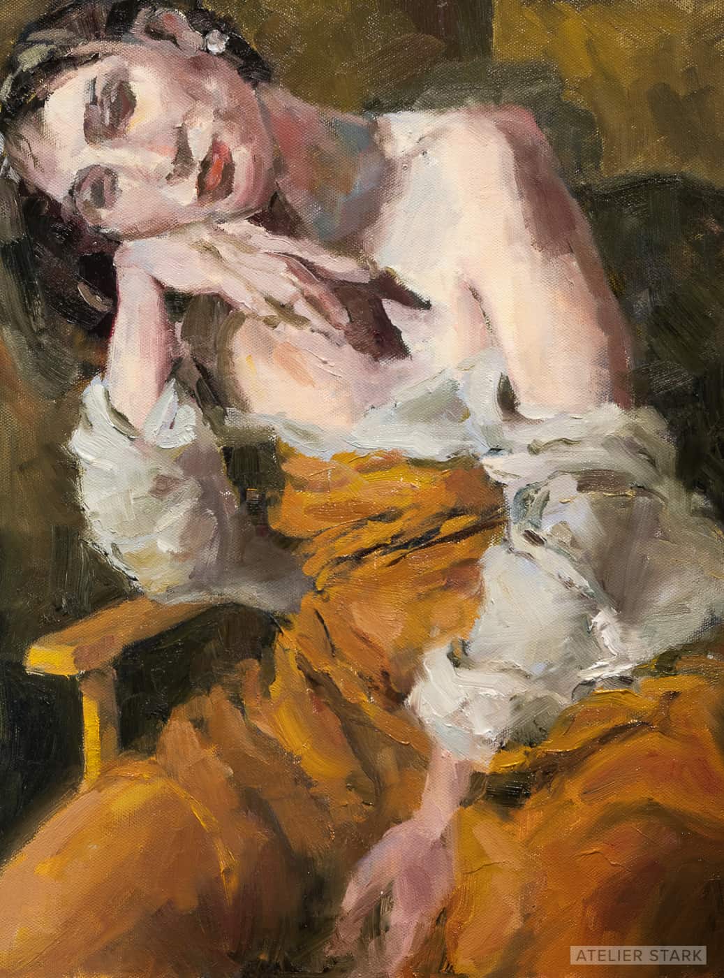 This week, I thought more about being a chameleon of style. To look at what is in front of me, in my mind and decide on how I want to respond. For example, these two paintings of women seated in chairs; they are very different in style because I responded differently to the shapes created by the poses and the mood I wanted to create.