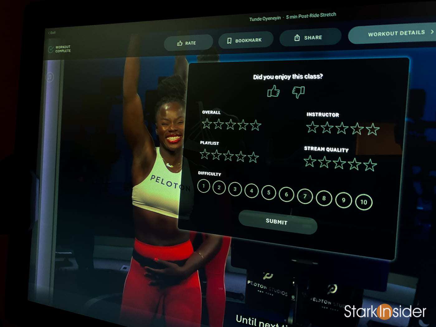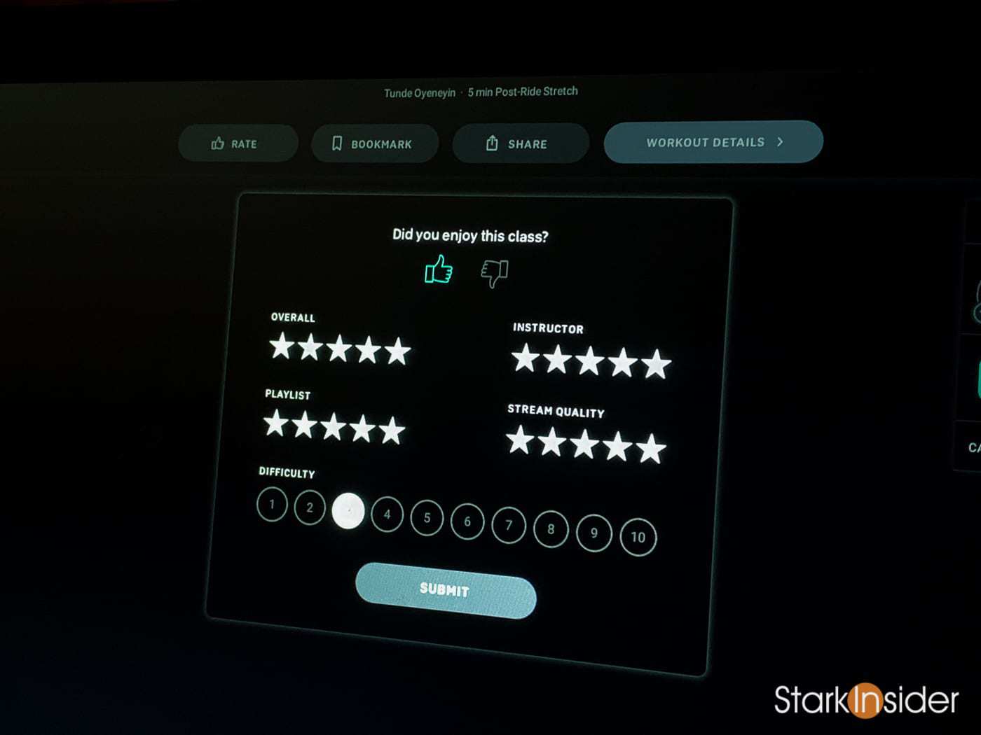 This is much appreciated. With the new software update post-ride reviews are no longer mandatory and no longer pop-up automatically — usually on top of the instructor’s face. Instead there’s an elegant bar at top with choices: rate, bookmark, share (Facebook, Fitbit, Strava) and workout details. I always do a review anyways, but I prefer being able to finish the complete ride, enjoy the brief last minute stretches before putting down my water and tapping in a quick review. For those that don’t own a Peloton bike, a review is straight forward. Thumbs up or thumbs down. And a 1-5 star rating for four categories: Overall, Instructor, Playlist, and Stream Quality (always been flawless for me). In addition you can let Peloton know how difficult you thought the class was (1-10) and most of the time there’s also an option to rate the accuracy of the target metrics for cadence and resistance (1-10).