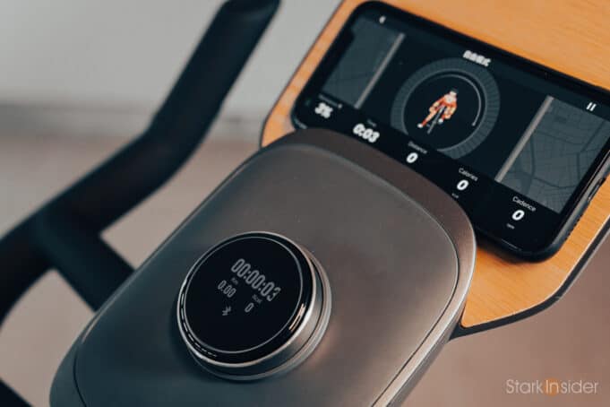On the last photo above you can see the bike is paired with my iPhone running the Mobifitness app (no subscription required). Core metrics are shown in the (rather nifty) control dial. Twisting it changes resistance. However, the app will do that for you automatically, allowing you to focus on the work at hand.