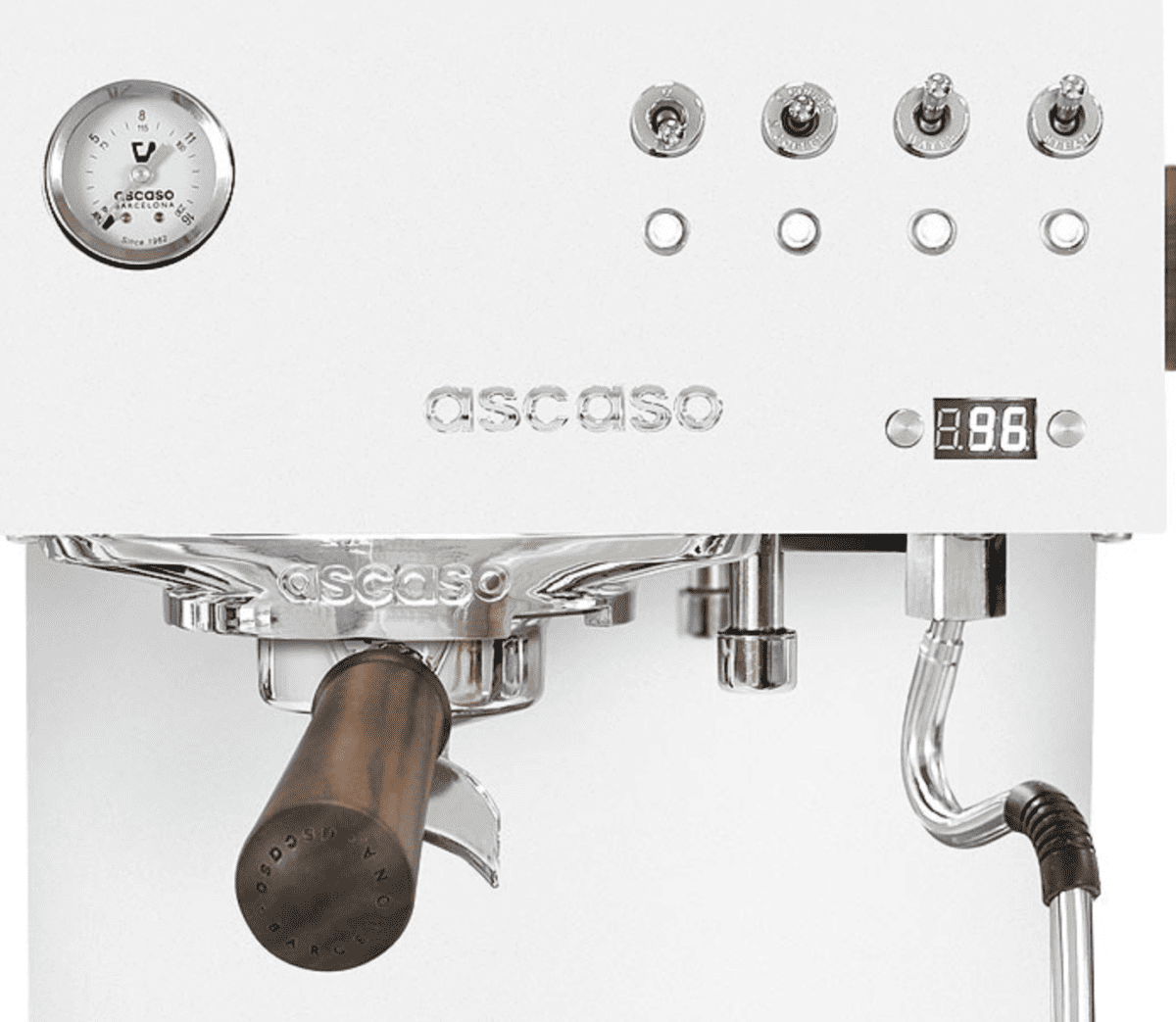 Ascaso Steel Uno with four toggle switches, PID controller and pressure gauge on top, and steam knob on righthand side