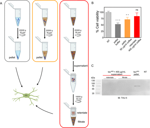 “Here, we show that aggregation of the tau protein is modulated by espresso coffee extract and some of its components, at both concentrations used in the experiments (i.e., 50 and 400 μg/mL). Intraneuronal tau concentration has been estimated to be about 2 μM, (57) 25 times less than what we have used in our experiments.”